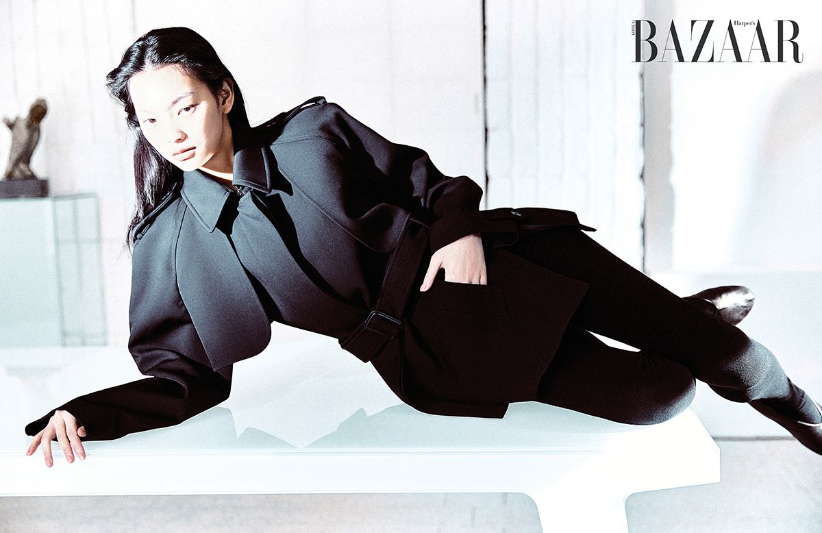 ‘로라나(Lolana)’ 코튼 트렌치코트, ‘가비나(Gavina)’ 셔츠, 숄, ‘미미’ 타이츠는 모두 The Row.