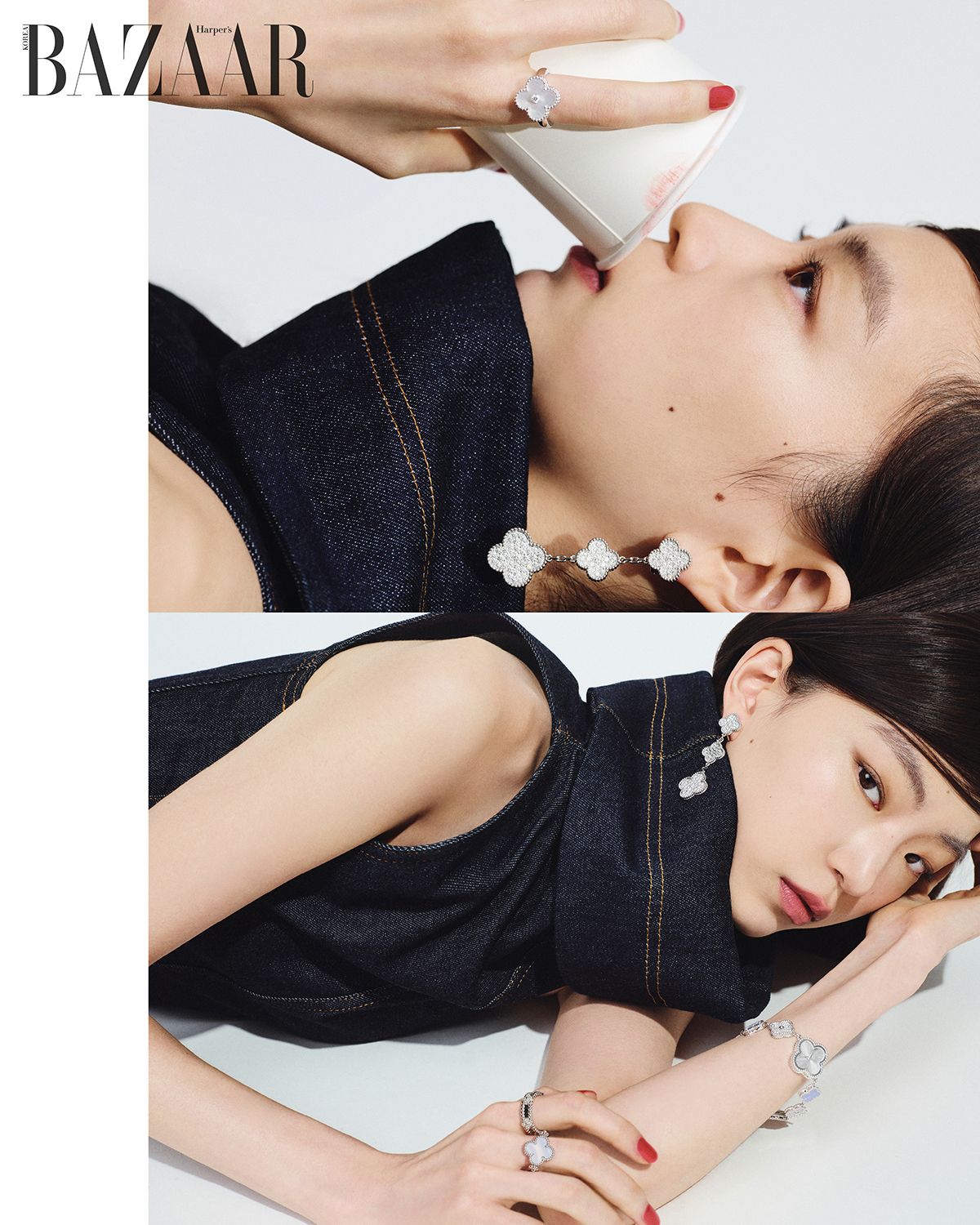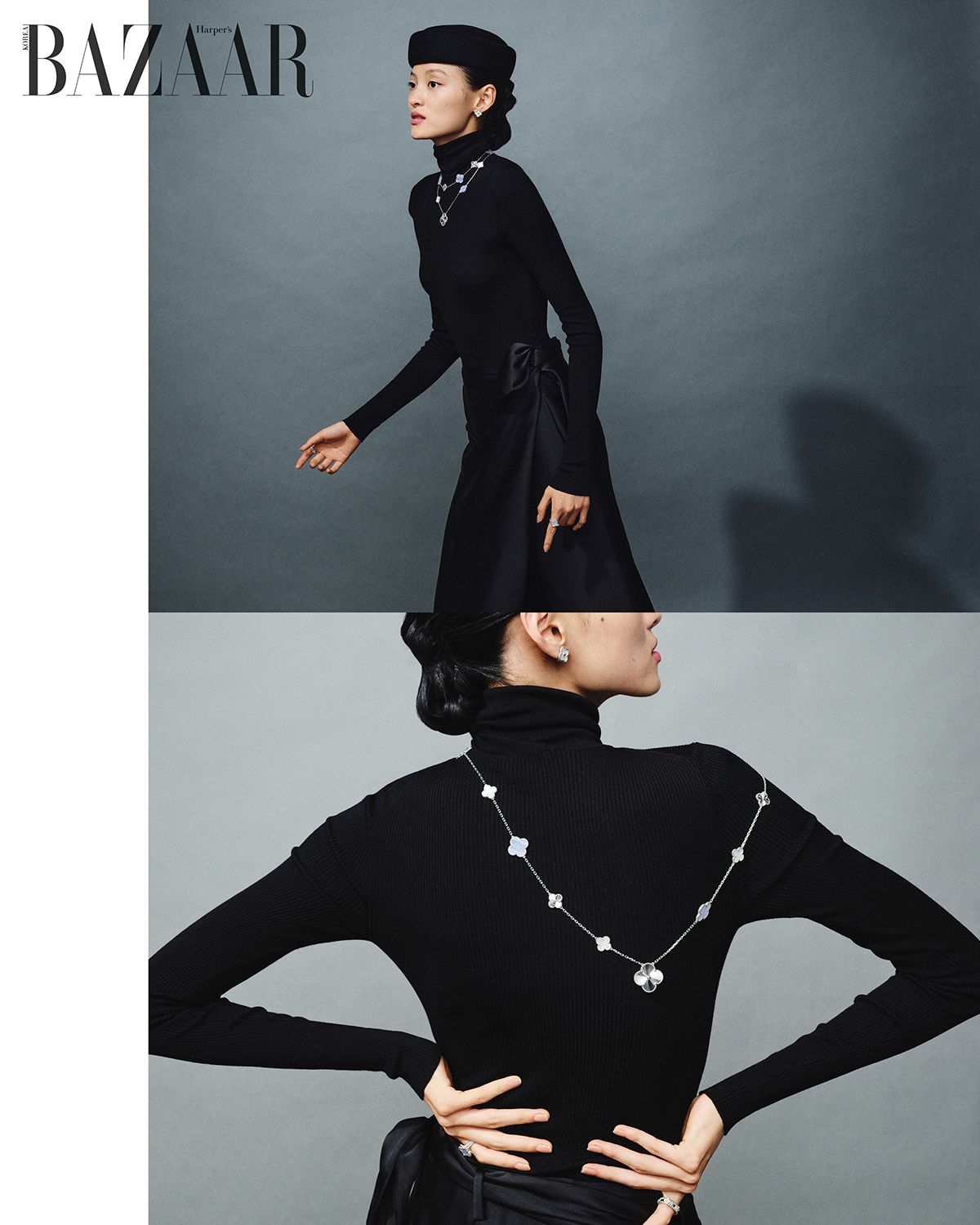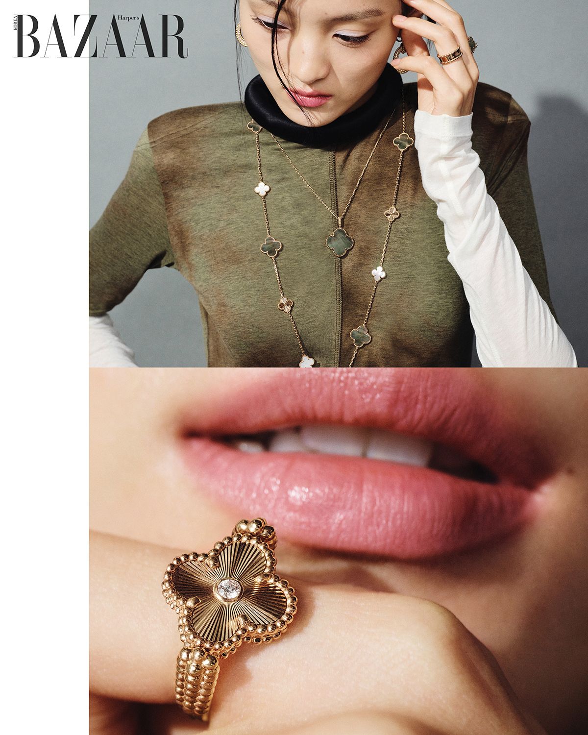 ‘빈티지 알함브라 이어링’, 더블 네크리스, 롱 네크리스, 브레이슬릿 세 가지로 연출 가능한 ‘매직 알함브라 트랜스포머블 롱 네크리스’, 오른손 검지에 낀 ‘뻬를리 스위트 클로버 링’, 왼손 검지에 낀 ‘빈티지 알함브라 리버서블 링’은 모두 Van Cleef & Arpels.