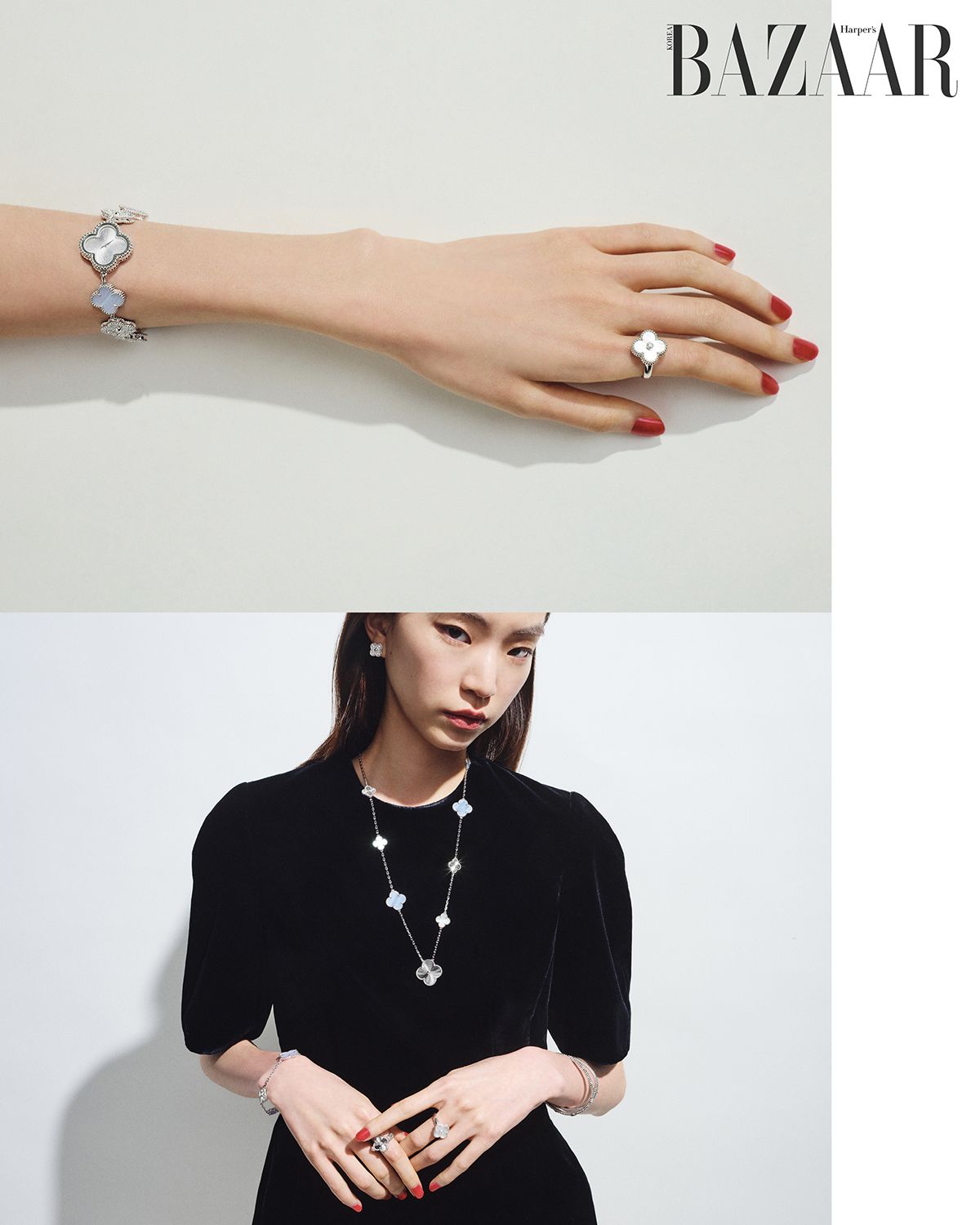 (아래) 다이아몬드를 파베 세팅한 ‘빈티지 알함브라 이어링’, 다양한 연출이 가능한 ‘매직 트랜스포머블 롱 네크리스’, 오른팔에 착용한 ‘스위트 알함브라 워치’, 오른손 검지에 착용한 ‘빈티지 알함브라 리버서블 링’, 왼손 중지에 착용한 ‘빈티지 알함브라 링’, 왼팔에 착용한 ‘뻬를리 시그너처 브레이슬릿’, 레이어드한 ‘뻬를리 스위트 클로버 브레이슬릿’은 모두 Van Cleef & Arpels.
