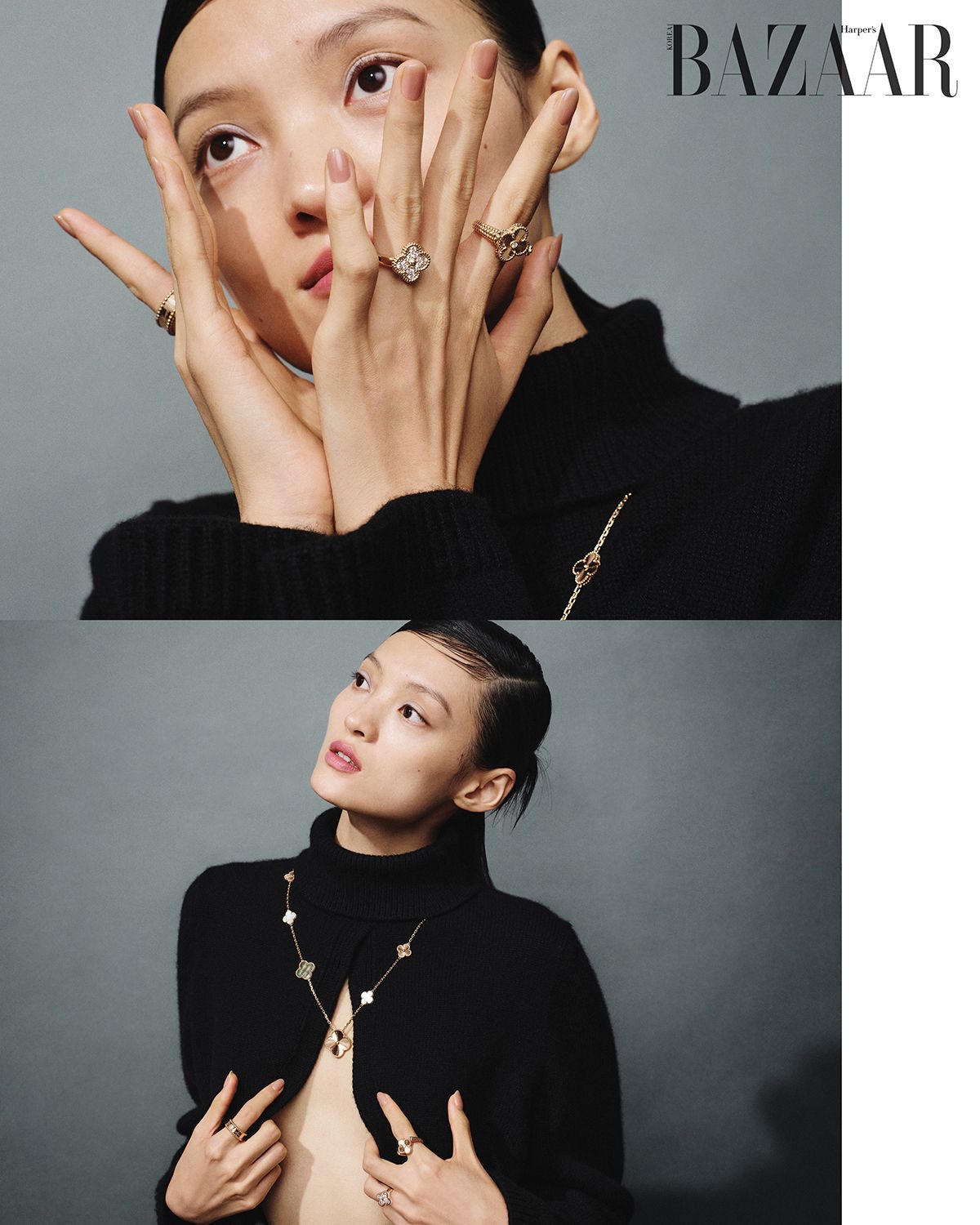 오른손 검지에 낀 ‘뻬를리 시그너처 링’, 왼손 약지에 낀 ‘빈티지 알함브라 링’, 검지의 ‘빈티지 알함브라 리버서블 링’, 다이아몬드를 세팅한 ‘매직 알함브라 트랜스포머블 롱 네크리스’는 모두 Van Cleef & Arpels.