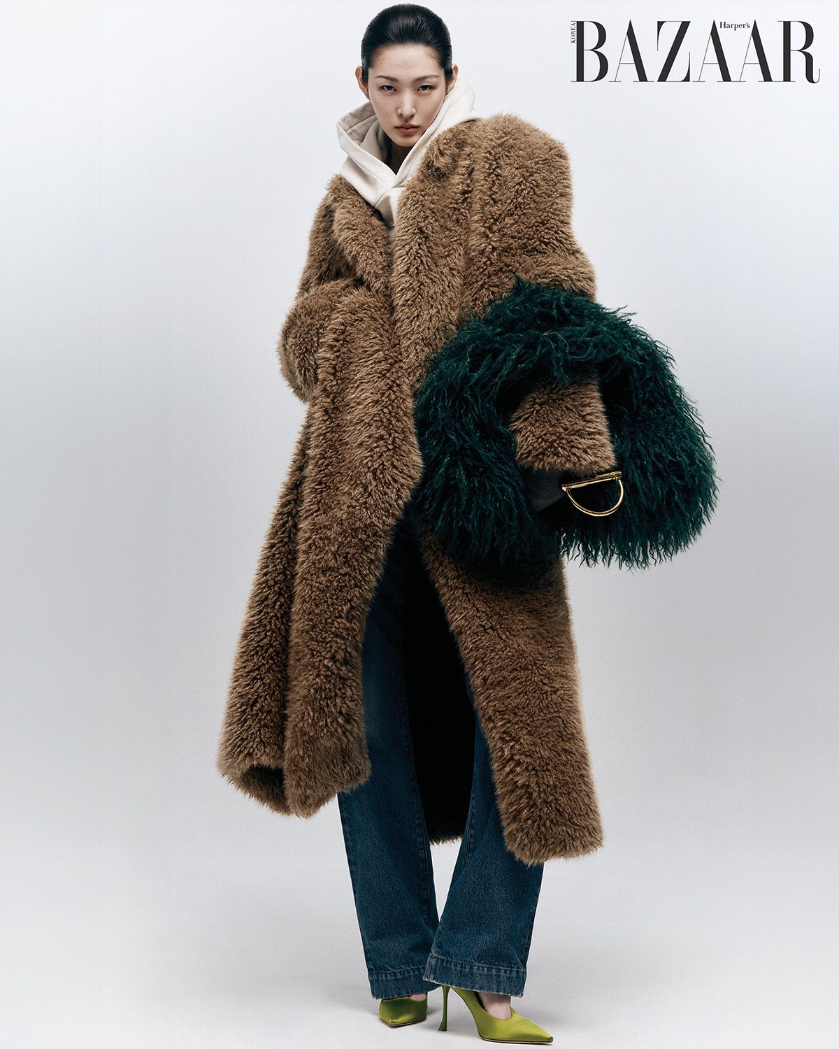 페이크 퍼 맥시 코트는 Eenk. 후디는 Dolce & Gabbana. 데님 팬츠는 McQueen. 페이크 퍼 숄더백은 Gucci. 펌프스는 Roger Vivier.