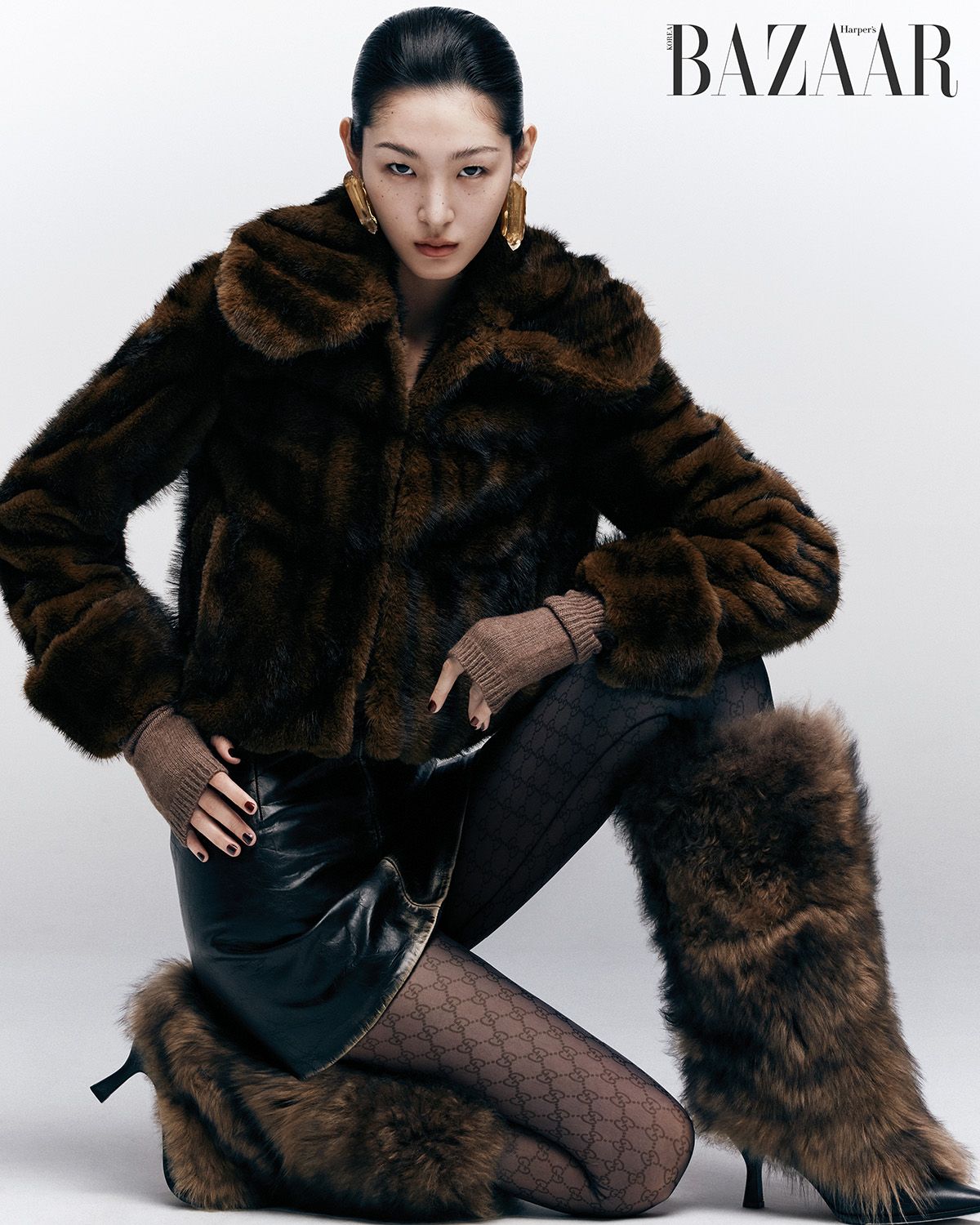 페이크 퍼 코트, 가방은 Dries Van Noten. 터틀넥은 Gabriela Hearst. 레깅스는 Chrome Hearts. 귀고리는 Self-Portrait. 목걸이는 Dolce & Gabbana. 장갑은 MaxMara. 롱 부츠는 1백70만원 Longchamp.
