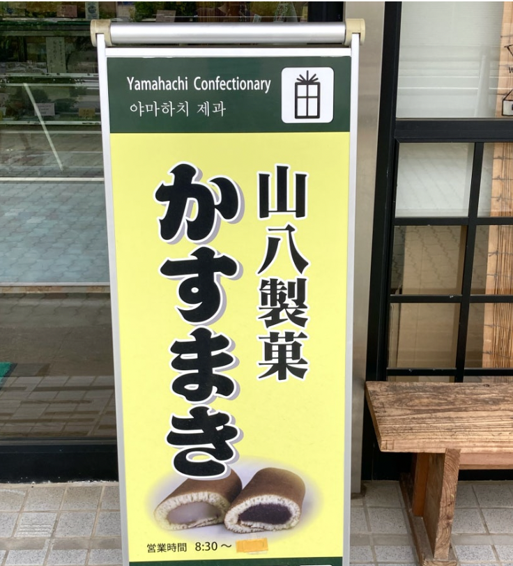 대마도 기념품인 카스마키와 모나카를 맛볼 수 있는 히타카츠의 명물이다. 히타카츠항에서 10-15분 정도 걸으면 유명 베이커리가 나오는데 간판에는 yamahachi, 山八製菓 라고 적혀져 있다. 카스마키, 모나카, 도리야키 등 다양한 종류가 있다. 백앙금, 흑앙금, 콩 등 각각 다른 소가 들어가기에 잘 보고 구매하면 된다. 카스마키는 바삭한 겉과 부드러운 속이 조화를 이루며, 맛은 도라야끼와도 비슷하다.