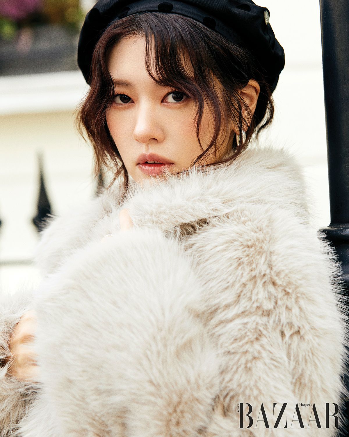 톤 다운된 컬러감과 부드러운 퍼 소재의 쇼트 재킷 LOEUVRE , 실버 후프 이어링 COS, 블랙 도트 배레모는 소장품.