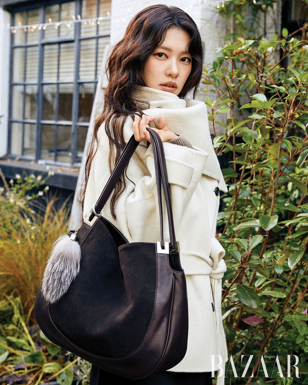 소프트한 울 원단으로 제작된 핸드 메이드 벨티드 하프 코트, 코코아 컬러 스카프 니트, 자연스러운 실루엣의 보네르백과 퍼 참 모두 LOEUVRE.