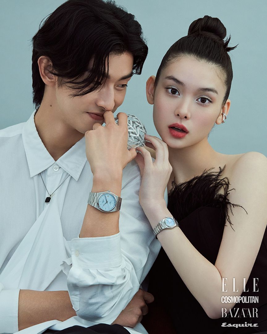 커플 시계로 추천하는 티쏘의 아이코닉 워치 PRX. 남자 모델이 착용한 아이스 블루 컬러 다이얼의 PRX 파워매틱 80 40mm 워치, 여자 모델이 착용한 아이스 블루 컬러 다이얼의 PRX 쿼츠 25mm 워치는 모두 가격 미정 TISSOT.
