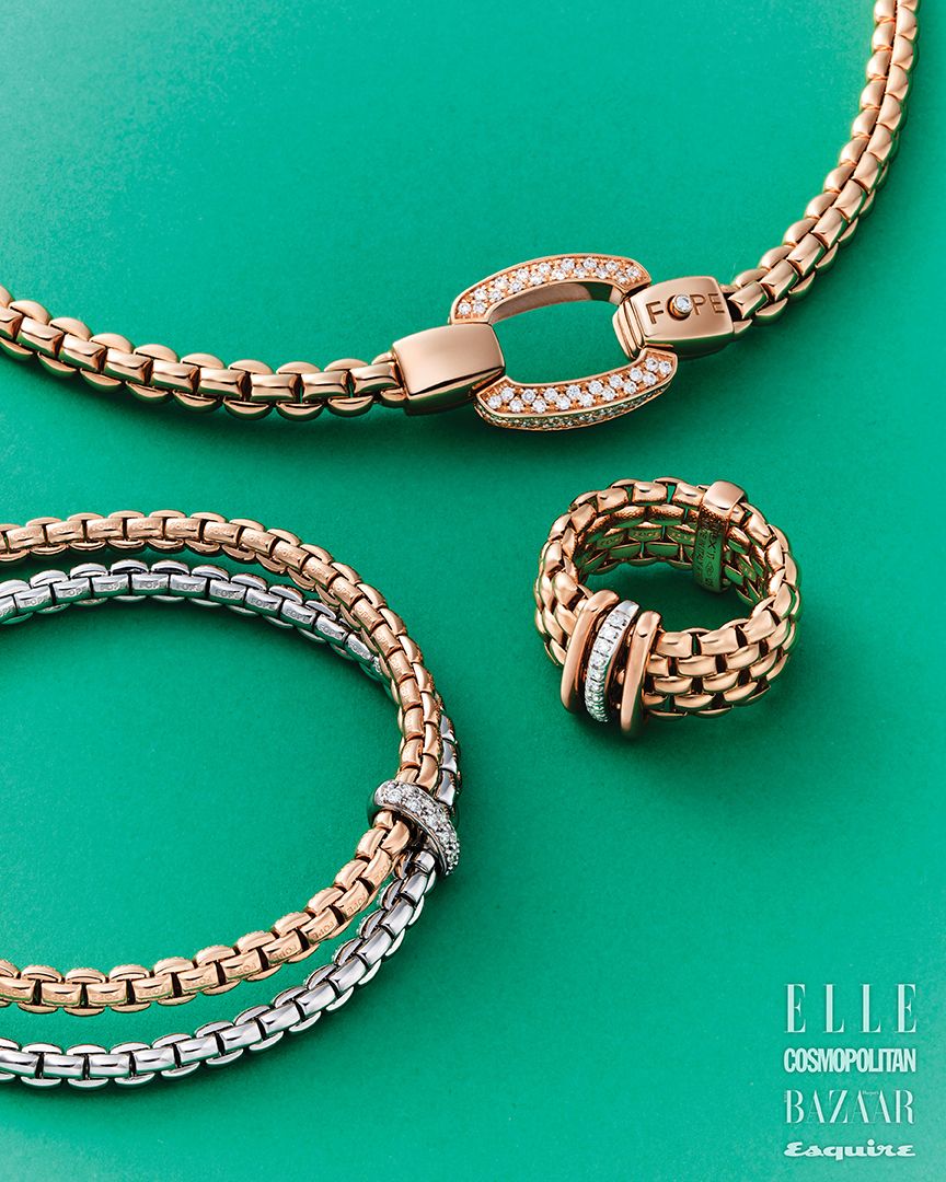 18K 로즈 골드 소재의 에카 컬렉션 다이아몬드 파베 클래스프 플렉스잇 네크리스, 18K 로즈 & 화이트 골드 소재의 에카 컬렉션 다이아몬드 투-로우 플렉스잇 브레이슬릿, 18K 로즈 골드 소재에 다이아몬드를 론델 세팅한 파노라마 컬렉션 플렉스잇 링은 모두 가격 미정 FOPE.