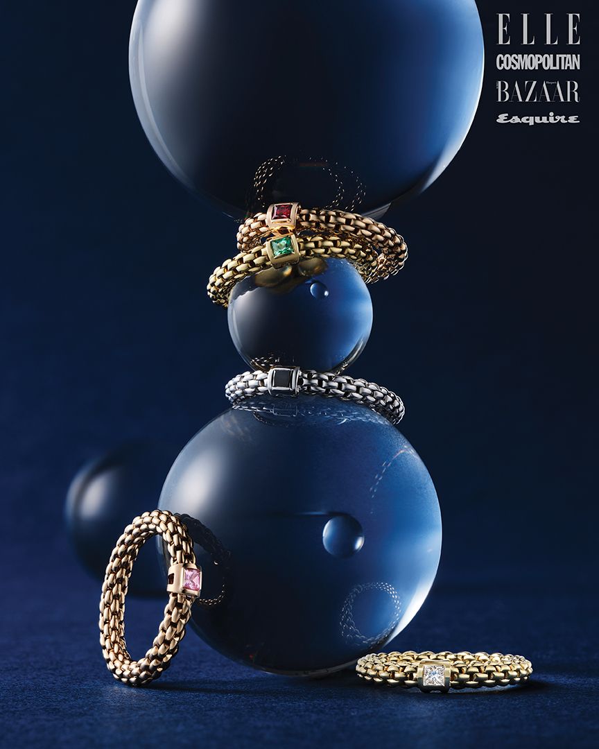 모든 형태의 사랑과 두 영혼의 유대를 상징하는 소울 컬렉션. (위부터) 18K 로즈 골드 소재의 루비 플렉스잇 링, 18K 옐로 골드 소재의 에메랄드 플렉스잇 링, 18K 화이트 골드 소재의 블랙 다이아몬드 플렉스잇 링, 18K 로즈 골드 소재의 핑크 사파이어 플렉스잇 링, 18K 옐로 골드 소재의 화이트 다이아몬드 플렉스잇 링은 모두 가격 미정 FOPE.