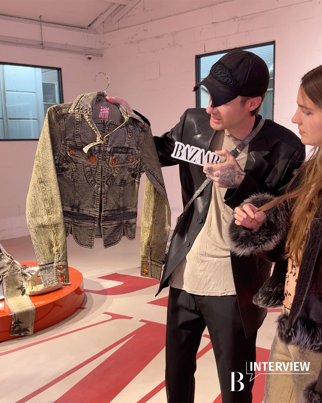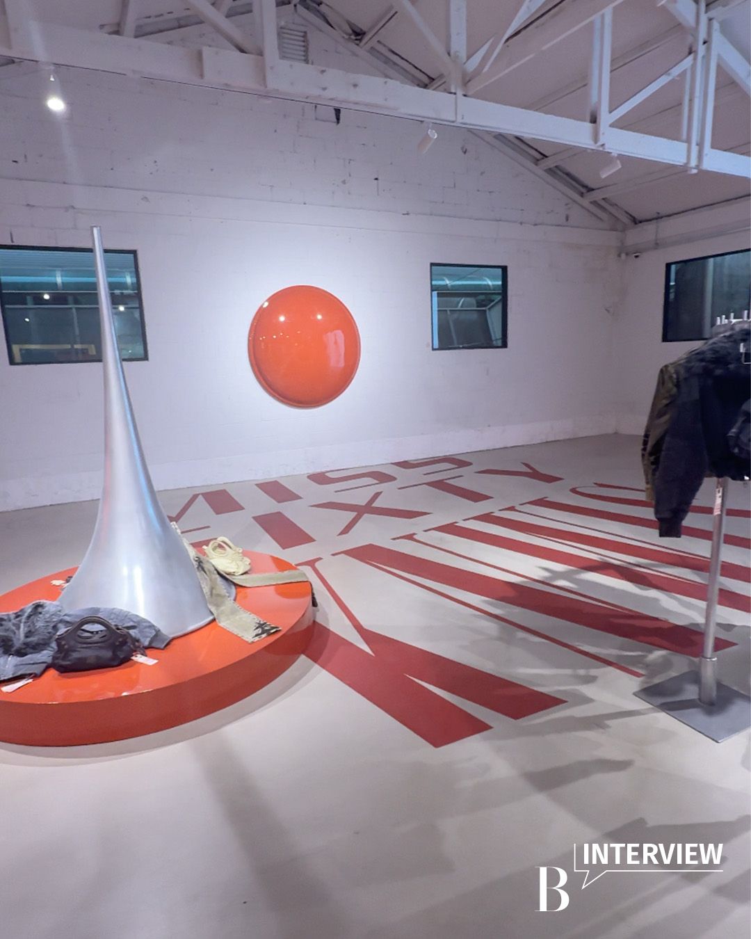 알렉산드레 아르세노 친구이자 세트 디자이너인 에밀리아노 마르가레스(Emiliano Margaret)와 함께 꾸민 공간이에요. 미스 식스티는 재미있고, 유머러스한, 너무 진지하지 않은 브랜드라고 느꼈거든요. 이번 컬렉션 아이템 중 과장된 실루엣의 플레어 팬츠가 있는데, 이게 트럼펫의 실루엣과 연결되면서 지금과 같은 구조적인 공간이 탄생했죠. 캠페인 이미지도 플레어 형태의 콘에 인쇄했고요. 미스 식스티의 아이코닉한 레드 컬러를 입은 도로 반사경과 바닥에 수놓은 로고 프린트까지. 이런 요소들이 사람들의 눈에 띄지만, 너무 과한 장난처럼 느끼진 않기를 바랐어요. 결과적으로 이 공간은 팝하지만, 현대적이고 깔끔함을 추구했다고나 할까요? 이 공간 덕에 이번 프로젝트가 더욱 신선하게 느껴지는 것 같아요.