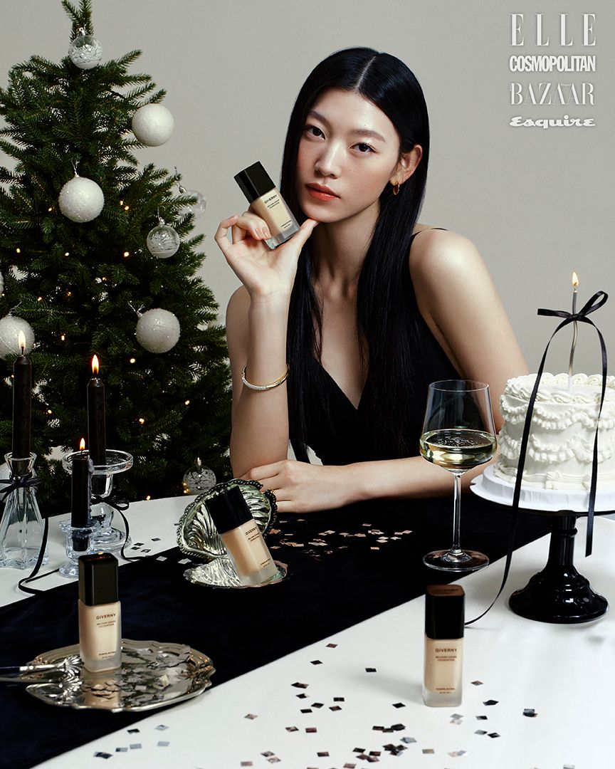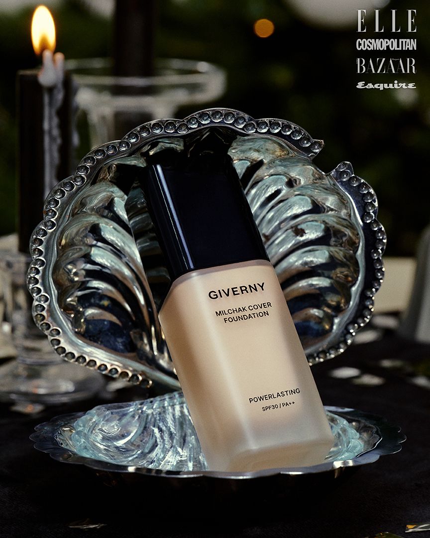 초슬림 텍스처가 피부에 균일하게 밀착되어 잡티와 결을 매끈하게 정돈한다. 지베르니 밀착 커버 파운데이션 10주년 블랙 에디션 30ml 3만3천원 (퍼스널 퍼프 7매입 & 리본 초 기획 세트, 올리브영 1월 한정 판매) 모두 GIVERNY.
