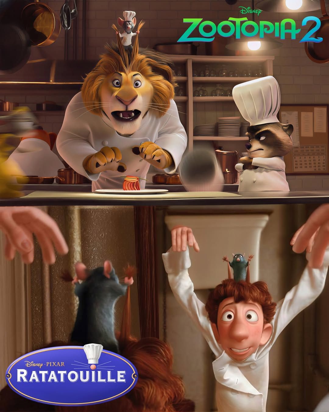 감독 재러드 부시가 자신의 X(구 트위터) 계정을 통해 영화에 대한 비하인드를 직접 밝히기도 해 화제가 되었다. 재러드 부시 감독에 따르면, 극중 주인공 주디가 입고 있는 드레스는 <미녀와 야수>의 벨 드레스를 오마주 한 것이라고 한다. 또한 주디와 닉이 한 연회장의 부엌을 가로지를 때 벌어지는 <라따뚜이> 패러디 장면이 압권이다. 요리사 사자의 모자가 벗겨지며 드러나는 요리사 쥐 설정은 픽사의 걸작 <라따뚜이>를 떠올리게 하고, 이를 지켜본 옆 동료 너구리 셰프가 “역시 그럴 줄 알았어!”라고 외치는 대목에서는 영화 <에브리씽 에브리웨어 올 앳 원스> 속 “라카쿠니” 패러디까지 이중으로 결합된다. 한 장면에 두 작품을 겹친 위트는 물론이고, 게리 역의 배우 키 호이 콴이 바로 그 영화로 아카데미상을 탄 사실까지 염두에 둔 것이라니 절로 미소 짓게 된다. 외에도 곳곳에 숨은 디테일을 찾는 재미가 있다. <겨울왕국>을 주토피아 세계관으로 패러디한 가상의 영화 작품이 등장하기도 한다.