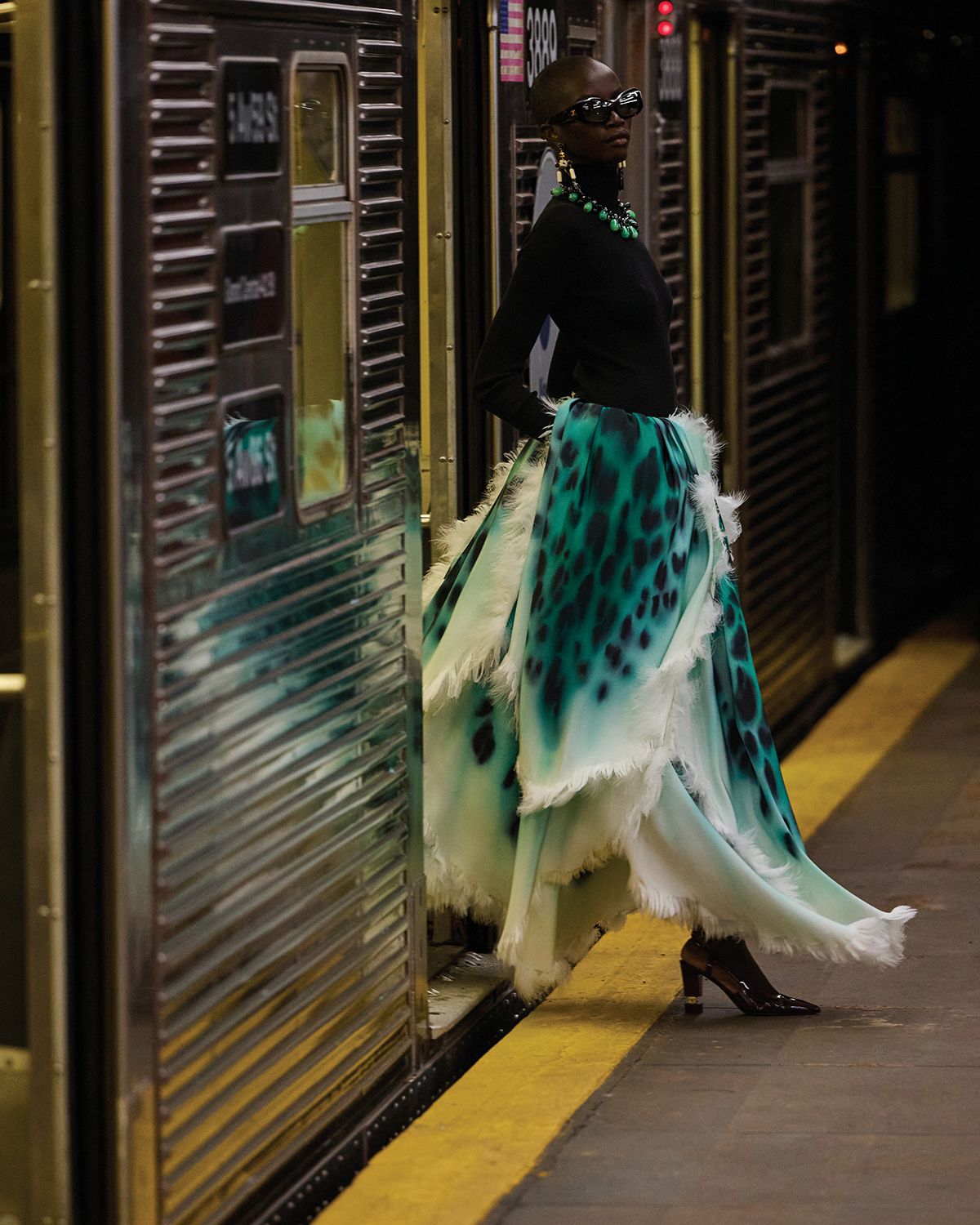 블라지는 슈퍼모델 라인업에도 의존하지 않는다. 10월 파리 쇼에서도 비교적 무명의 모델들을 캐스팅했고, 피날레를 장식한 아와르 오디앙의 워킹과 미소는 그를 단숨에 스타로 만들었다. 이번에도 마찬가지였다. 시카고의 매니 라판, 조지아주 제섭의 라일리 러셔, 캔자스의 놀리 먼, 그리고 오프닝 문을 연 바비타 만다바 역시 이번이 생애 두 번째 쇼였다. 보스턴에서 온 마야 아난드는 대학 4학년으로, 기말시험을 2주 앞두고 생애 첫 런웨이를 걸었다. “목요일에 첫 시험이 있는데, 그럼 뉴욕에 와서 런웨이를 걷기 딱 좋은 타이밍 아니겠어요?”라는 그녀의 코멘트는 어쩐지 현실적이면서도 비현실적이다. 모델들은 브라질, 캐나다, 세네갈, 남아프리카에서도 왔다. 쇼 막바지, 가볍고 중성적인 매력을 지닌 유라 로마니우크가 이브닝 수트를 입고 등장했다. 미우미우 2023 봄/여름 데뷔 이후, 그는 남성복과 여성복의 경계를 자연스럽게 지워온 모델이다. 그와 동시에 프런트 로에는 에이셉 라키가 앉아 있었다. 최근 샤넬의 새로운 앰배서더로 발탁된 그는 마거릿 퀄리와 함께 미셸 공드리가 연출한 단편영화에도 출연했다. 샤넬의 패션 부문 사장인 브루노 파블로브스키는 “우리는 여성 브랜드지만, 남성에게도 제안할 수 있는 제품을 기쁘게 제공한다”고 말했다. 경계를 긋지 않는다는 것, 그 말이 이번 쇼에서 유라와 라키가 보여준 모든 장면을 자연스럽게 설명해주었다. 지하철은 누구에게나 열려 있는 가장 민주적인 공간이지만, 동시에 가장 철저한 무관심의 장소이기도 하다. 사람들은 이어폰을 끼고 휴대폰을 바라본 채 서로를 외면한다. 그럼에도 가끔 누군가의 옷차림이 시선을 붙든다. 기묘하게 아름다운 코트, 유머가 스친 신발, 설명할 수 없이 예쁜 가방. 그 작은 장면 하나가 무관심의 막을 찢는다. “저 사람은 누구일까? 어디로 향하는 걸까?” 우리는 타인의 일상을 상상하고, 패션은 그 상상의 문을 여는 장치가 된다. 타인의 아름다움을 발견하게 만들고, 조금 더 들여다보게 만드는 것. 레오퍼드 트위드를 입은 저 사람은 캣 레이디일까, 혹은 현대판 캣우먼일까? 황금빛 비늘이 박힌 플랩 백을 든 저 여성은? 기말시험을 앞둔 대학생은? 각자의 이야기를 가진 주인공들. 블라지가 말했듯, “영화 속 이야기처럼, 그들은 각자의 이야기 속 주인공”이다.