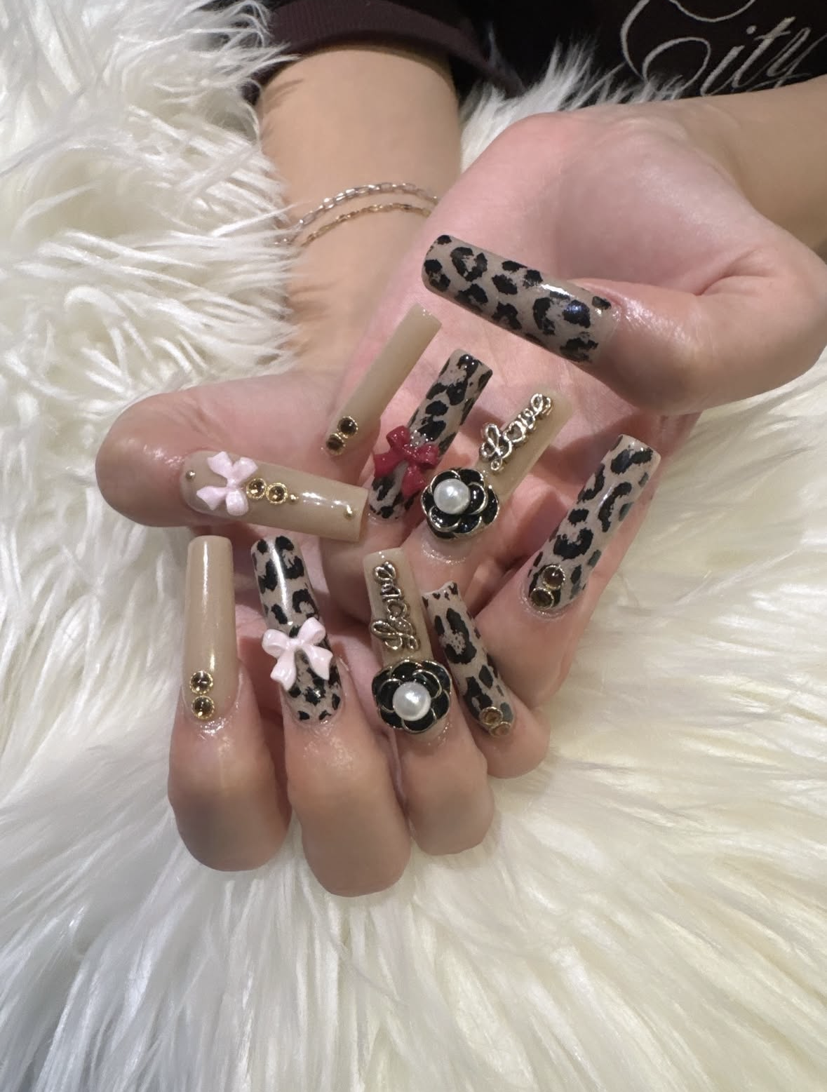 타이핑이나 생활에서 불편할 정도의 길이를 감수해야 비로소 갸루 네일이라 말할 수 있다. 한껏 과장된 기장의 스틸레토 혹은 스퀘어 연장 팁 위에 큼직한 파츠와 리본, 스톤을 마구 올릴수록 싱크로율이 비슷해질 것. 네일 전체 면적이 넓으니 레오퍼드나 글리터, 진주처럼 텍스처가 강한 것들도 돋보이고, 손 모양도 길게 예뻐 보이는 효과도 노릴 수 있다.