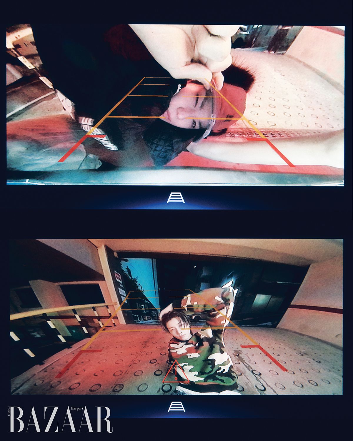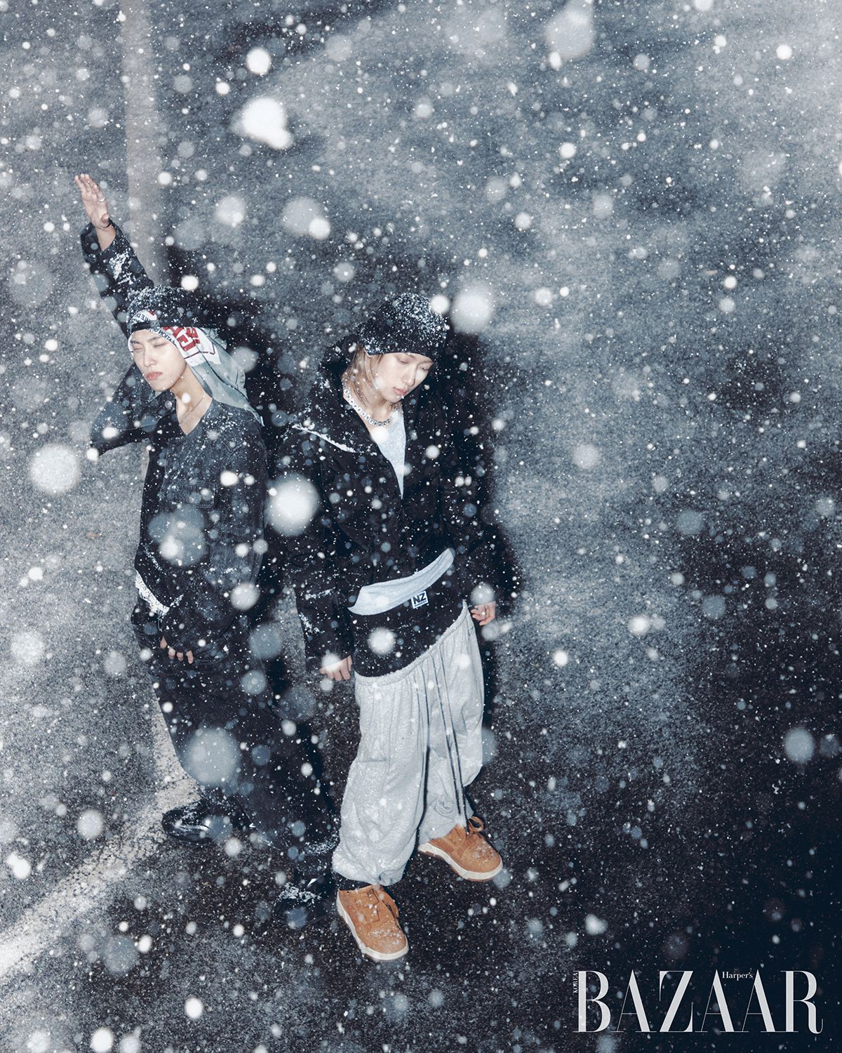 률이 착용한 재킷, 팬츠는 Diesel. 모자는 Surgery. 스카프는 Jean Paul Gaultier. 슈즈는 Balenciaga. 이너 톱은 스타일리스트 소장품. 우진이 착용한 모자는 Namesake. 팬츠는 Natasha Zinko. 슈즈는 Amiri. 재킷, 슬리브리스 톱, 목걸이는 스타일리스트 소장품.