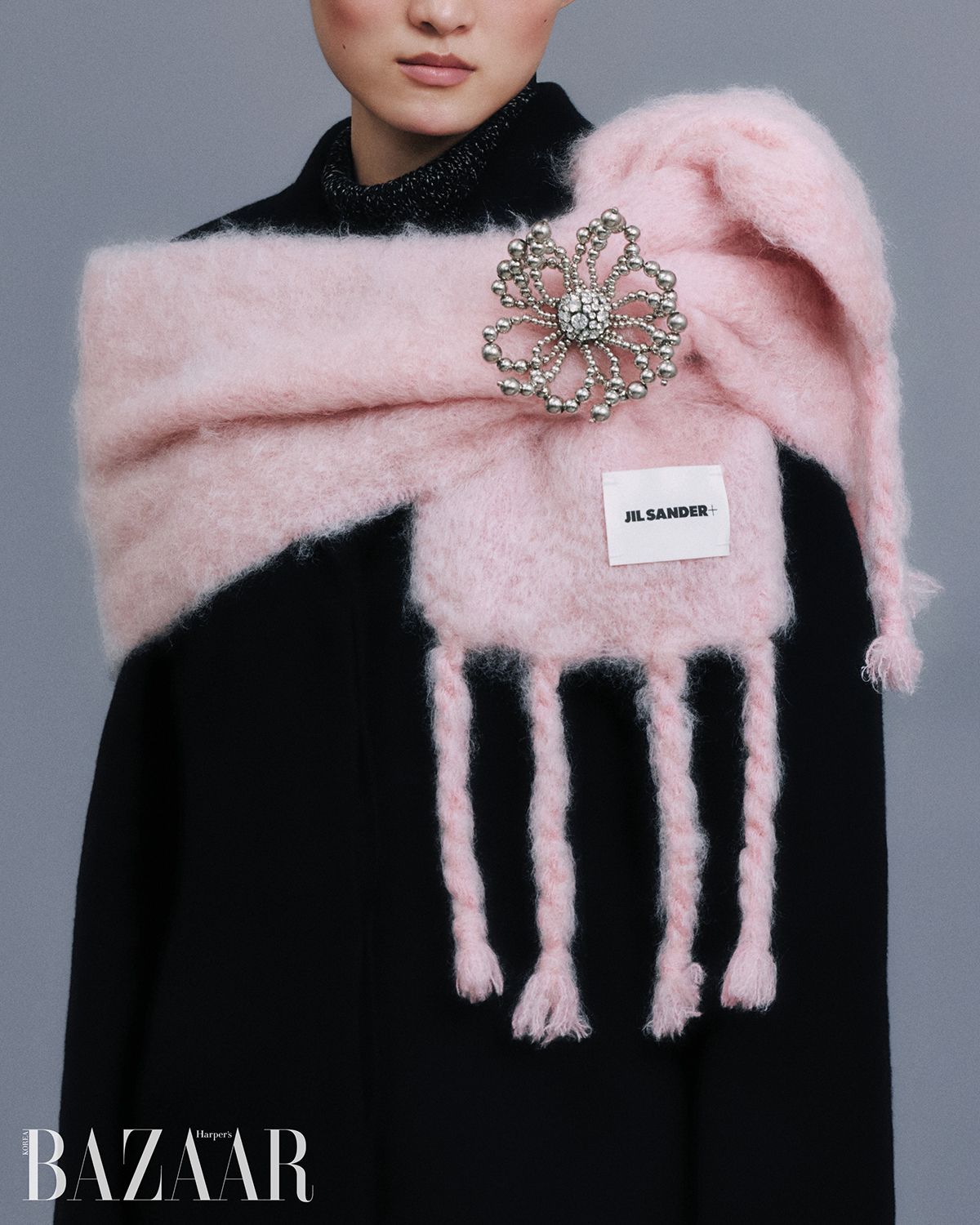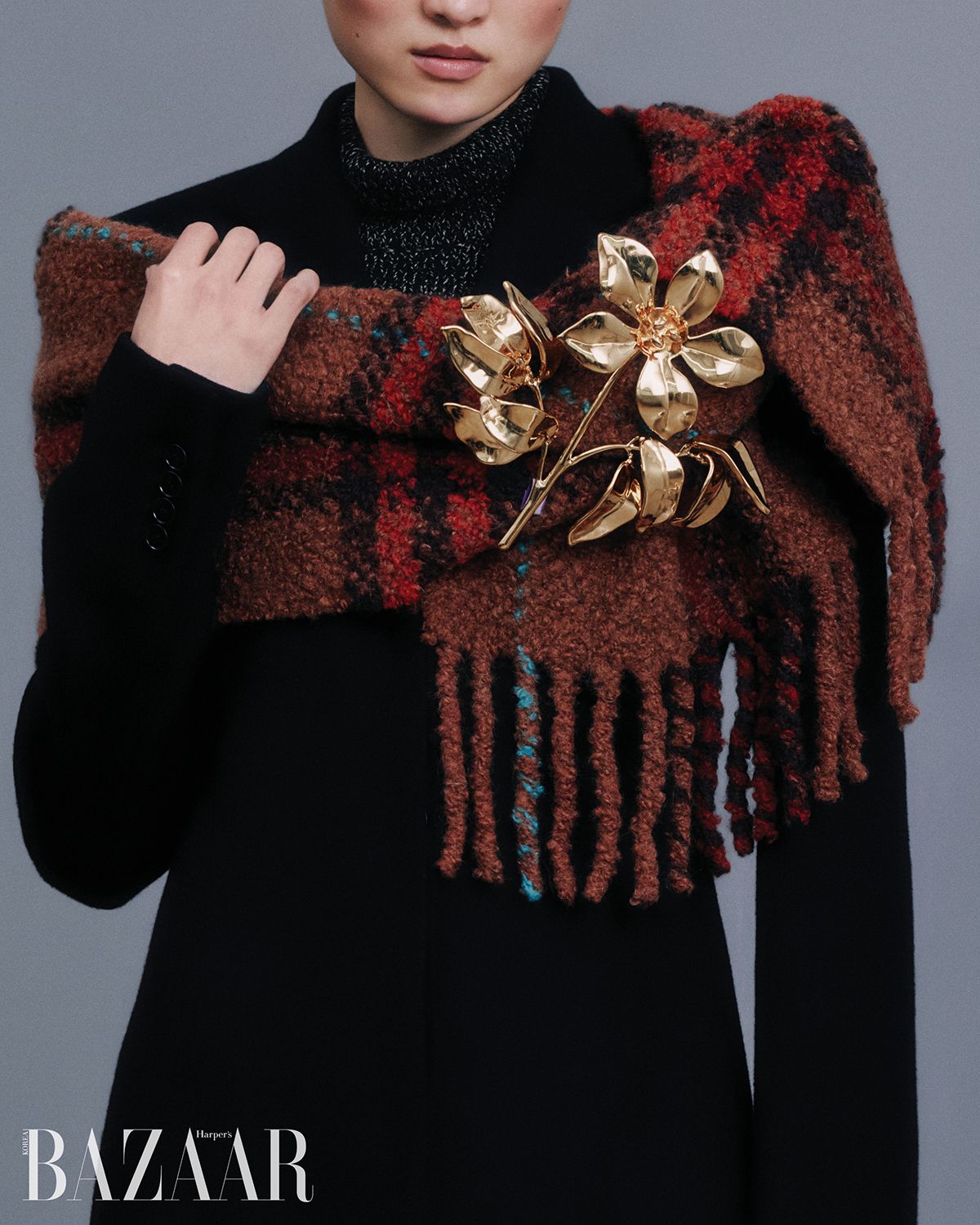 미니멀한 윈터 룩에 한 끗을 더하다. 스타일과 보온성, 그 모두를 충족시키는 머플러와 브로치의 콤비 플레이.
