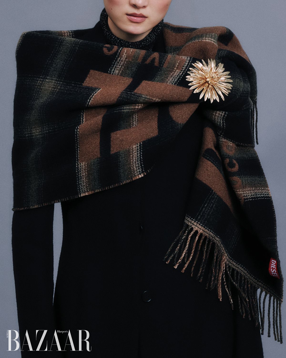 로고 레터링 머플러는 37만원 Diesel. 골드 메탈 브로치는 Chanel.
