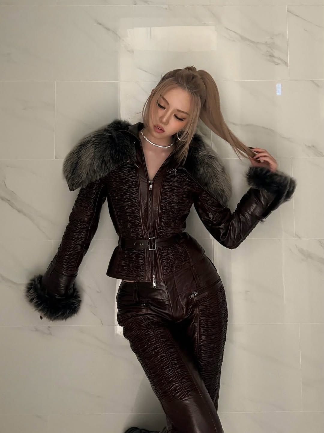 2000년 초반의 스타일리시한 룩이 생각나는 베일리의 퍼 트리밍 룩! 섬세한 주름 장식이 돋보이는 퍼 트리밍 디테일의 벨트 장식 레더 아우터와 팬츠의 조합은 강렬하면서도 우아하다. 그 시절 걸그룹들의 무대 의상이 떠오르는 레더 셋업과 강인한 퍼 트리밍의 조합은 별다른 주얼리나 액세서리 없이도 그 자체도 빛난다.