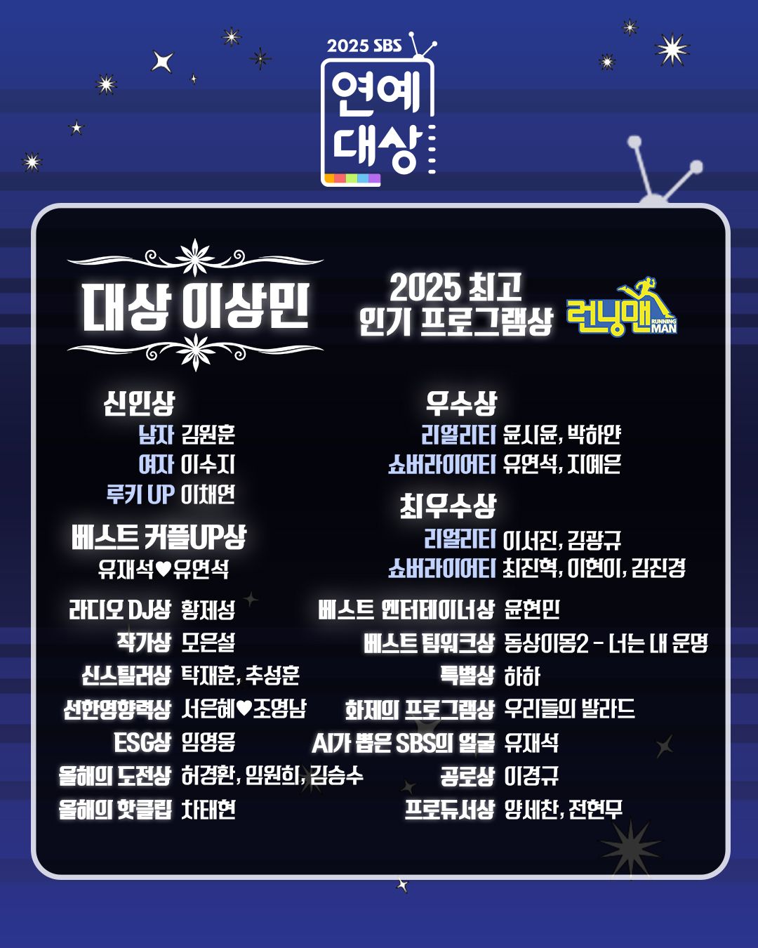 이하 '2025 SBS 연예대상' 수상자(작)