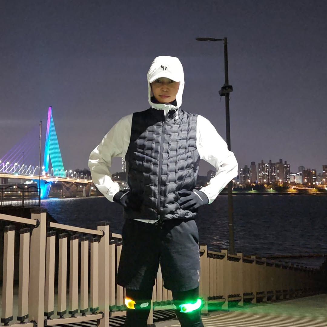 임영웅 역시 러닝 마니아로 잘 알려져 있다. 그가 대회에 나오는 순간 지금보다 더 대회 참석이 어려워질 것이란 농담이 나올 정도. 담백한 스타일을 자주 보여주는 만큼 그의 러닝 패션 역시 정석에 가깝다. 겨울 레깅스 위에 쇼츠, 얇은 재킷 위에 경량 패딩 베스트, 장갑과 형광 무릎 밴드를 찬 것까지 안전하고 따뜻한 겨울 러닝 룩의 정석이니 첫 겨울 러닝 시 참고하면 좋겠다.