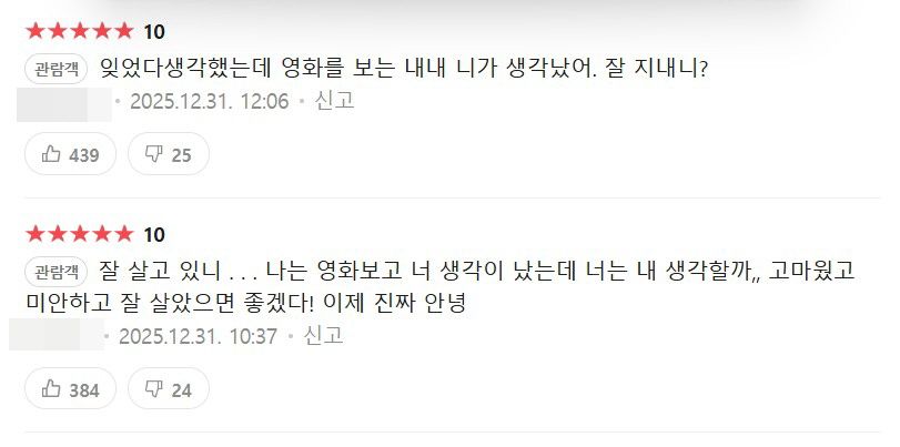 이러한 현상의 기저에는 관객들이 이 영화를 하나의 ‘감정적 안전 자산’으로 삼으려는 심리가 맞닿아 있다. 불확실한 미래로 나아가는 대신, 이미 지나온 길이라 더 이상 나를 배신하지 않는 과거의 기억 속에 잠시 머물며 숨을 고르는 것이다. 우리가 10년 전 은호와 정원의 아픈 사랑을 지켜보며 함께 눈물 흘리는 진짜 이유는, 그들이 놓쳐버린 것이 단지 눈앞의 연인이 아니라 다시는 돌아갈 수 없는 우리 자신의 가장 빛나던 한 조각임을 비로소 깨달았기 때문일 것이다.
