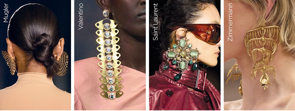 마치 루브르 박물관에서 탈출한 듯한 스테이트먼트 귀고리가 대세로 떠올랐다. 생 로랑은 이브 생 로랑의 뮤즈이자 패션 주얼리 디자인에 깊이 관여한 룰루 드 라 팔레즈(Loulou de La Falaise)를 연상케 하는 XXL 바로크풍 귀고리를 더해 시선을 모았다. 그외에도 크리스털 장식으로 반짝임을 더한 블루마린과 리처드 퀸, 에스닉한 가죽 프린지가 돋보이는 드롭 형태의 귀고리를 선보인 마이클 코어스, 조형적인 디자인의 샹들리에 귀고리를 매치한 발렌티노와 뮈글러, 미소니까지. 이번 시즌, 룩에 드라마틱한 에너지를 불어넣는 스테이트먼트 귀고리로 스타일 지수를 높여볼 것.