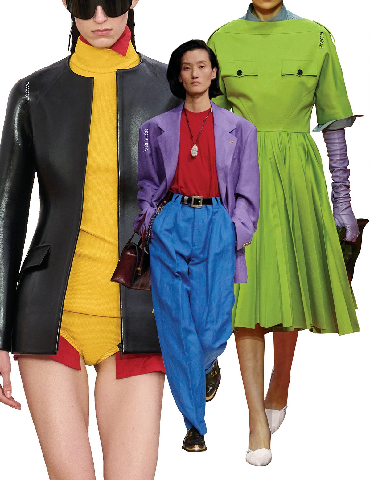 낙관적인 원색의 컬러가 런웨이를 물들였다. 다가올 봄에 대한 기대감은 포근하고 부드러운 파스텔 컬러가 아닌 활기찬 브라이트닝 컬러로 발현되었고, 각자의 역할을 톡톡히 해냈다. 볼륨감 있는 이브닝드레스에 풍부한 컬러를 덧입힌 생 로랑, 구조적이며 리드미컬한 스커트에 컬러로 방점을 찍은 알라이아 등 몇 개의 인상적인 컬러를 선보인 디자이너도 있었지만 이번엔 ‘컬러 충돌’이라는 표현이 적절한, 대담한 컬러 조합이 주목을 받았다. 스칼렛 레드는 이브클라인 블루 혹은 카나리아 옐로를 만나 강렬함을 더했고, 그리너리 그린은 라벤더와 색다른 시너지를 보여주었다. 흥미로운 사실은 첫 쇼를 선보이는 디자이너들의 컬렉션에서 이 흐름을 더 쉽게 발견할 수 있었다는 것. 로에베, 베르사체, 발렌시아가, 질 샌더가 대표적인 예다.