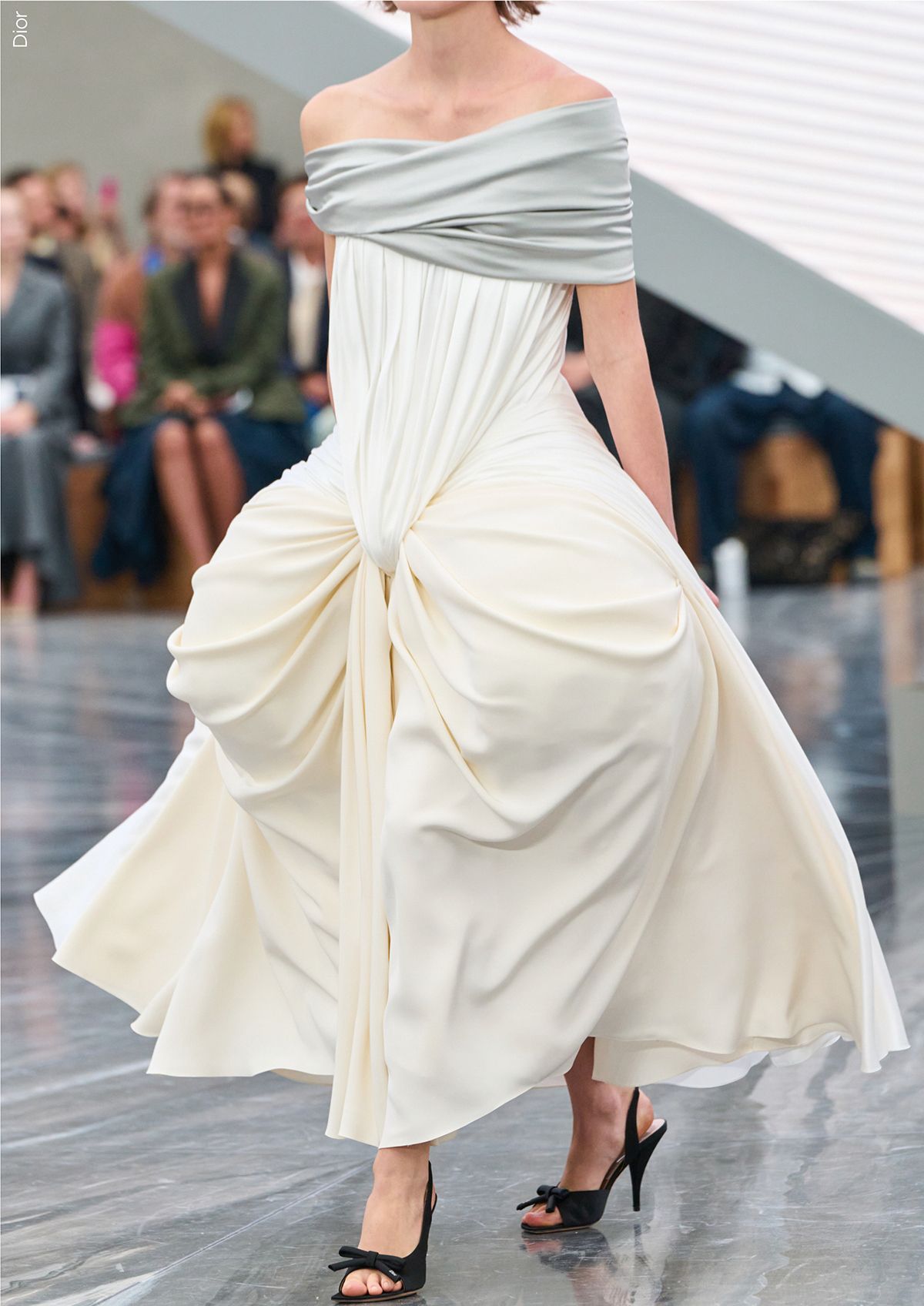 룩에 드라마틱함을 불어넣는 데 볼륨만 한 요소가 또 있을까? 여기에 18세기 로코코 스타일의 부흥까지 더해져 어깨와 힙라인, 나아가 스커트의 헴라인에 볼륨을 장착한 룩이 대거 등장했다. 주목할 포인트는 바로 힙라인의 확장. 디올, 사카이, 시몬 로샤, 장 폴 고티에 등에서 찾아볼 수 있었던 파니에(panier, 스커트를 넓히기 위해 허리에 넣는 틀이나 패티코트를 이르는 말)를 재해석한 드레스는 마치 하나의 조각품처럼 느껴졌다. 한편 첫 번째 발렌시아가 쇼를 선보인 피에르파올로 피촐리는 헴라인의 볼륨에 주목해 조형적인 볼륨감이 돋보이는 스커트 및 드레스를 선보이기도. 1990년대 미니멀리즘과 조용한 럭셔리가 잠시 뒤편으로 물러나고, 화려함과 장식적인 것에 대한 욕망이 다시금 패션 판타지를 불러일으키고 있다.