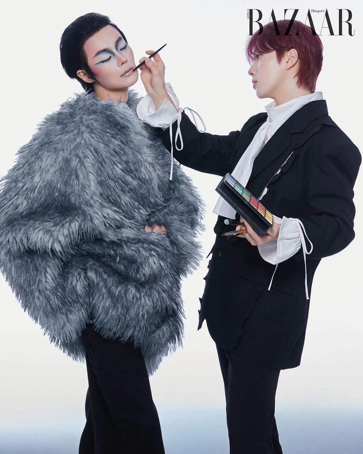 2000년대 록스타 데이비드 보위를 비현실적인 색감으로 재해석했다. 이성욱의 매혹적인 눈매를 날렵한 아이라인으로 강조하고, 레드 블러셔로 대담한 인상을 더했다. 컬러의 균형을 고려해 입술은 누드 톤을 선택했지만, 글로스를 더해 위트를 살렸다. 별을 노래하던 데이비드 보위를 떠올리며, 노래하는 입술 위에는 별처럼 반짝이는 글리터를 얹었다.