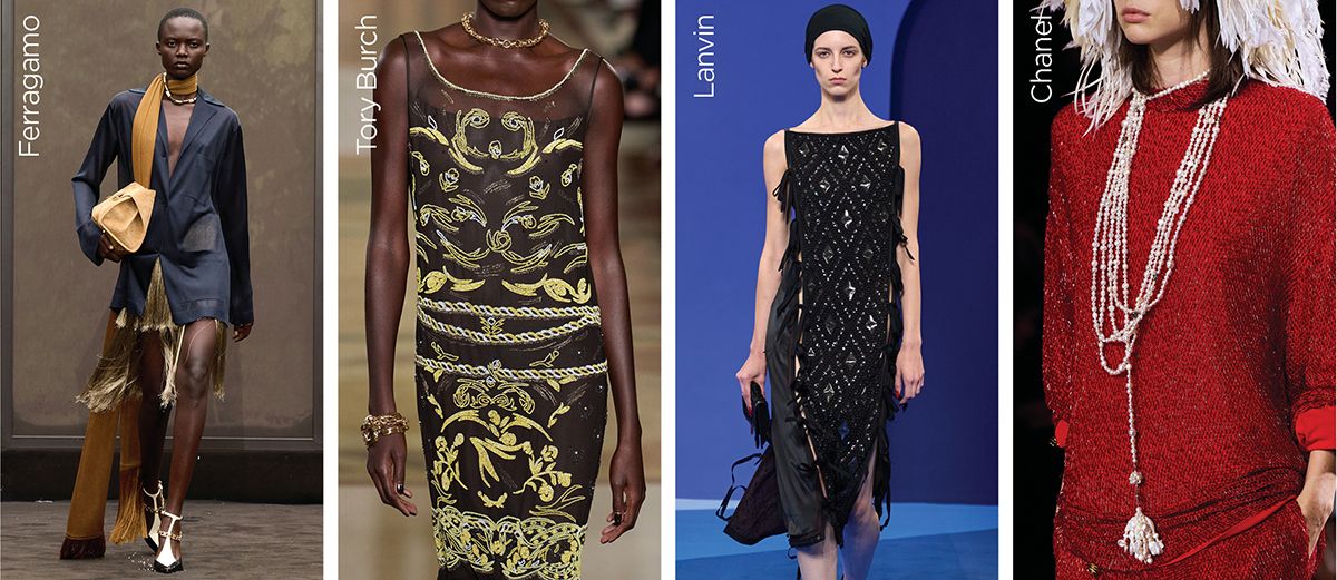 2025년, F. 스콧 피츠제널드의 소설 <위대한 개츠비(The Great Gatsby)>가 출간 100주년을 맞았다. 이를 축하라도 하듯 1920년대 재즈시대의 미학, 즉 자유와 환상 그리고 욕망을 우아하고 관능적으로 보여주는 룩이 대거 등장했다. 신체 해방의 상징인 드롭 웨이스트 실루엣부터 시퀸 장식 스트레이트 드레스, 춤을 위해 존재하는 듯한 프린지 드레스, 칭칭 감은 진주 목걸이와 깃털 장식에 이르기까지. 샤넬, 페라가모, 랑방, 베르사체, 토리 버치 쇼를 참고해볼 것.