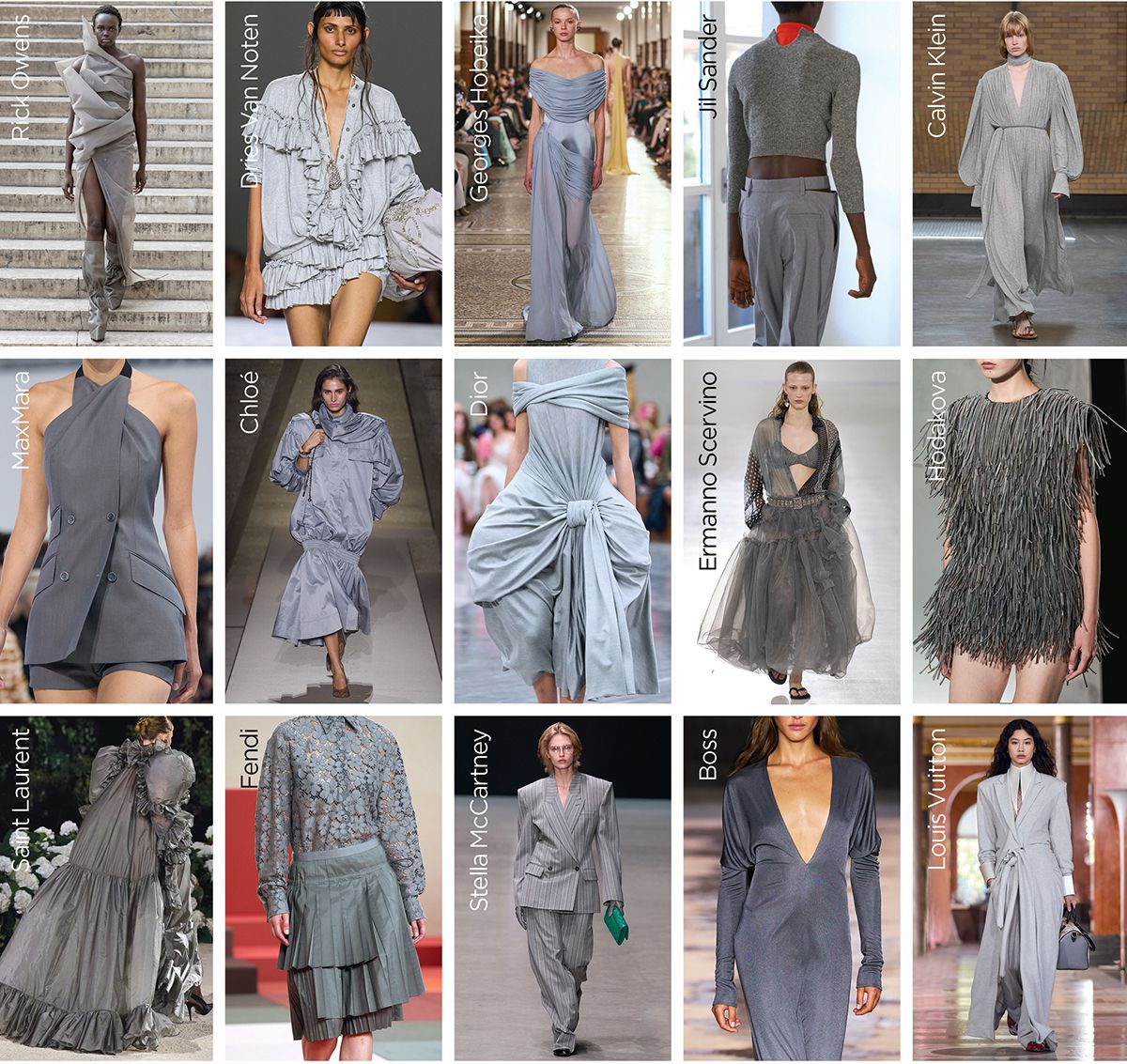무채색인 그레이 컬러가 이렇게 변화무쌍하다니! 그도 그럴 것이 다수의 디자이너들이 드레이핑과 셔링 등 다양한 디테일을 활용해 모던한 그레이를 설렘 가득한 컬러로 재해석했기 때문. 메탈릭한 그레이부터 페일 그레이, 차콜 그레이 등 스펙트럼을 넓혀 그레이의 다층적인 면모에 주목했다. 디올에서의 첫 여성 컬렉션을 선보인 조너선 앤더슨은 독특한 드레이핑 기법의 드레스로 그레이의 우아함을 강조했고, 캘빈 클라인은 특유의 미니멀한 디자인으로 그레이 컬러의 세련미를 극대화했다. 보스는 가슴 아래까지 파인 롱 드레스로 그레이의 관능미를 끌어올렸으며, 끌로에는 남성적인 워크웨어 아우터를 변주한 드레스에 그레이 컬러를 덧입히며 강인한 여성상을 그렸다. 그 외에도 그레이의 여유로움을 담은 루이 비통, 페일한 그레이 튤 드레스로 로맨틱함을 가미한 에르마노 설비노까지. 이번 시즌 런웨이 위에서 그레이는 조연이 아니라 주연으로 활약했다.