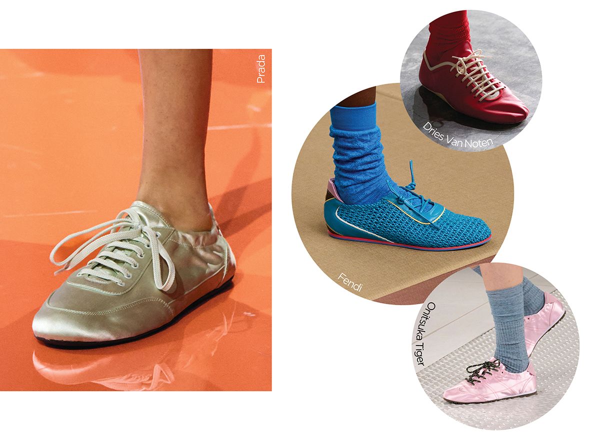 이번 시즌 스니커즈는 바닥부터 달라졌다. 두툼한 아웃솔 대신 얇고 평평한 로 솔이 주류로 떠오른 것. 러닝화나 트레일 슈즈처럼 기능을 전면에 내세우기보다 발의 형태와 착화감에 집중한 미니멀한 실루엣이 특징이다. 볼륨을 덜어낸 덕에 팬츠 밑단이나 스커트 길이가 또렷하게 드러나며, 룩 전체가 한층 가볍게 보인다. 힘 있는 레더 소재를 곁들인 드리스 반 노튼, 비비드한 컬러의 프라다·오니츠카 타이거·펜디처럼 포인트 역할을 분명히 하는 선택지도 눈에 띈다.