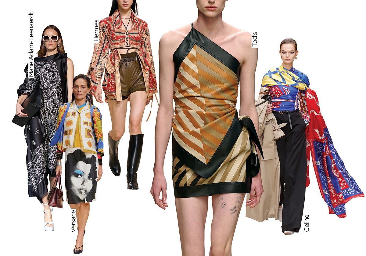 실크 스카프가 액세서리를 넘어 옷으로 확장됐다. 목이나 가방에 더하는 장식이 아니라 몸에 두르고 묶어 상의나 드레스 형태로 변주된 것. 정형화된 패턴 대신 비대칭으로 감거나 여러 장을 겹쳐 실루엣을 조정하는 스타일링이 주를 이룬다. 가볍고 유연한 질감 덕분에 룩에 자연스러운 리듬이 덤으로 생긴다. 에르메스는 힘 있는 레더 브라톱 사이로 목에 두른 스카프 끝단을 끼워 홀터넥처럼 연출했고, 셀린은 한쪽 어깨에 스카프를 둘러 묶어 걸을 때마다 흩날리는 아방가르드한 톱을 완성했다. 토즈는 큼지막한 스카프로 원 숄더 드레스를 구현했다.