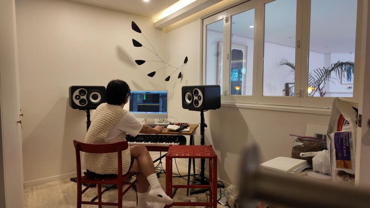 작곡가이자 음악 감독이 본업인 정재형의 작업방 역시 유튜브에서 공개된 적 있는 공간. 별도의 작업방을 갖고 있는 만큼, 심플하게 구성되어 있는 작업공간을 설명하던 그는 작업방과 작업실에 같은 스피커를 두어 동일한 모니터 환경을 맞췄다는 설명을 더하기도 했다. 기능을 중심으로 한 작업방임에도 리듬감이 느껴지는 것은 작업 테이블 위의 알렉산더 칼더 스타일의 모빌과 레드 브라운 컬러 체어와 스툴 그리고 머스터드 옐로우 컬러의 조명으로 포인트를 준 덕분이다.