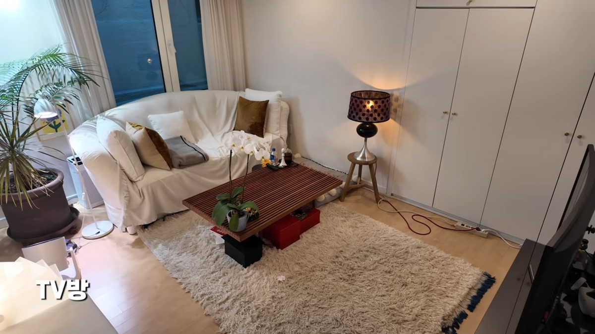 TV 방을 소개하던 정재형이 소개한 이전 집 주인에게서 받은 소파는 공간에 딱 맞는 아담한 사이즈와 편안한 디자인으로 공간에 아늑함을 더한다. 흰 천을 입힌 소파의 옆에 생기를 더하는 이색적 디자인의 조명은 정재형이 파리 빈티지 마켓에서 구매한 것이다.