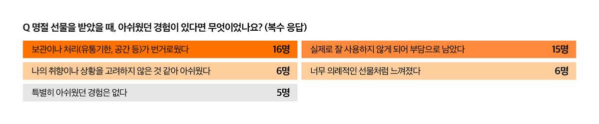 기억에 남는 명절 선물에 대한 질문에는 실제로 자주 손이 가는, 실용성이 좋은 선물을 꼽은 응답(20명)이 가장 많았다. 받는 사람의 취향을 고려해 고른 선물일수록 만족으로 이어진다(18명)는 반응도 뒤따랐다. 반면, 보관이 번거롭거나 결국 사용 되지 않는 선물은 아쉬운 기억(16명)으로 남았다. 명절 선물의 가치는 첫인상에서 시작되지만, 결국 일상 속에서 얼마나 자연스럽게 쓰이느냐에 따라 완성된다.