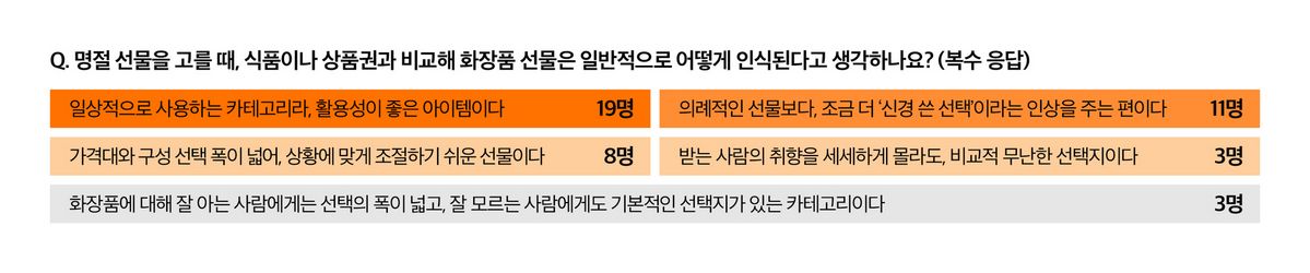 여전히 명절 선물로 식품류나 상품권을 먼저 떠올리는 이들이 많았지만, 화장품을 새로운 대안으로 떠올리는 경우도 점점 늘고 있다. 일상적으로 사용하는 제품이라는 점에서 실용성을 갖춘 화장품은 선물로서의 만족도 역시 높게 평가됐다. 설문에서도 ‘활용성이 좋은 카테고리’라는 인식(19명)과 ‘의례적인 선물보다 더 신경 쓴 선택’이라는 응답(11명)이 두드러지며, 화장품이 명절 선물의 대안으로 자리 잡고 있음을 보여준다.