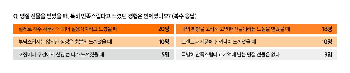 」*기사 내 서베이는 최근 2년 내 명절 선물을 직접 준비한 경험이 있는 3040 여성 30명을 대상으로 진행된 설문입니다. 복수 응답 문항은 정확한 비교를 위해 퍼센트 대신 응답 수(n) 기준으로 표기되었습니다.