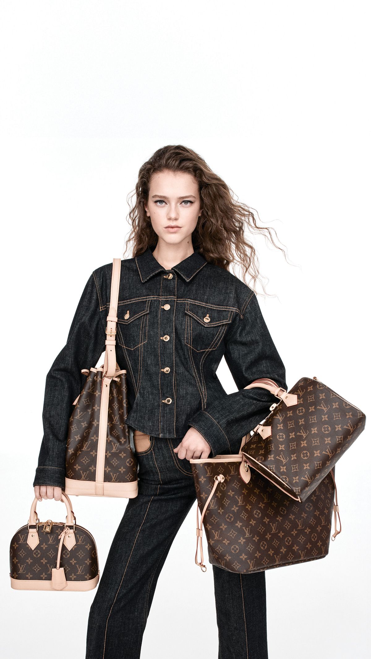 데님 재킷·팬츠 세트업, 오른손에 든 ‘알마 BB’ 톱 핸들 백, 어깨에 멘 ‘노에’ 숄더백, 왼팔에 걸친 ‘스피디 반둘리에 25’ 백, 레이어드한 ‘네버풀 MM’ 백은 모두 Louis Vuitton.