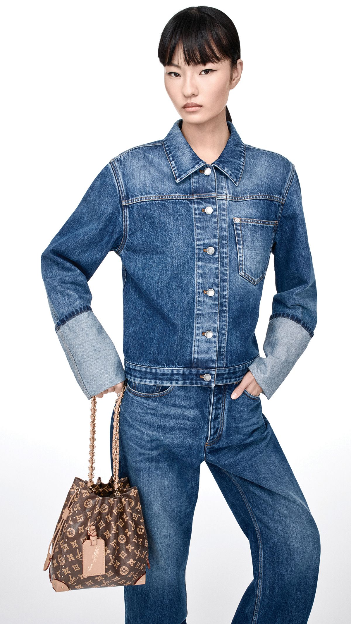 데님 재킷·팬츠 세트업, ‘모노그램 애니버서리’ 컬렉션의 ‘노에 트렁크’ 체인 크로스 백은 모두 Louis Vuitton.
