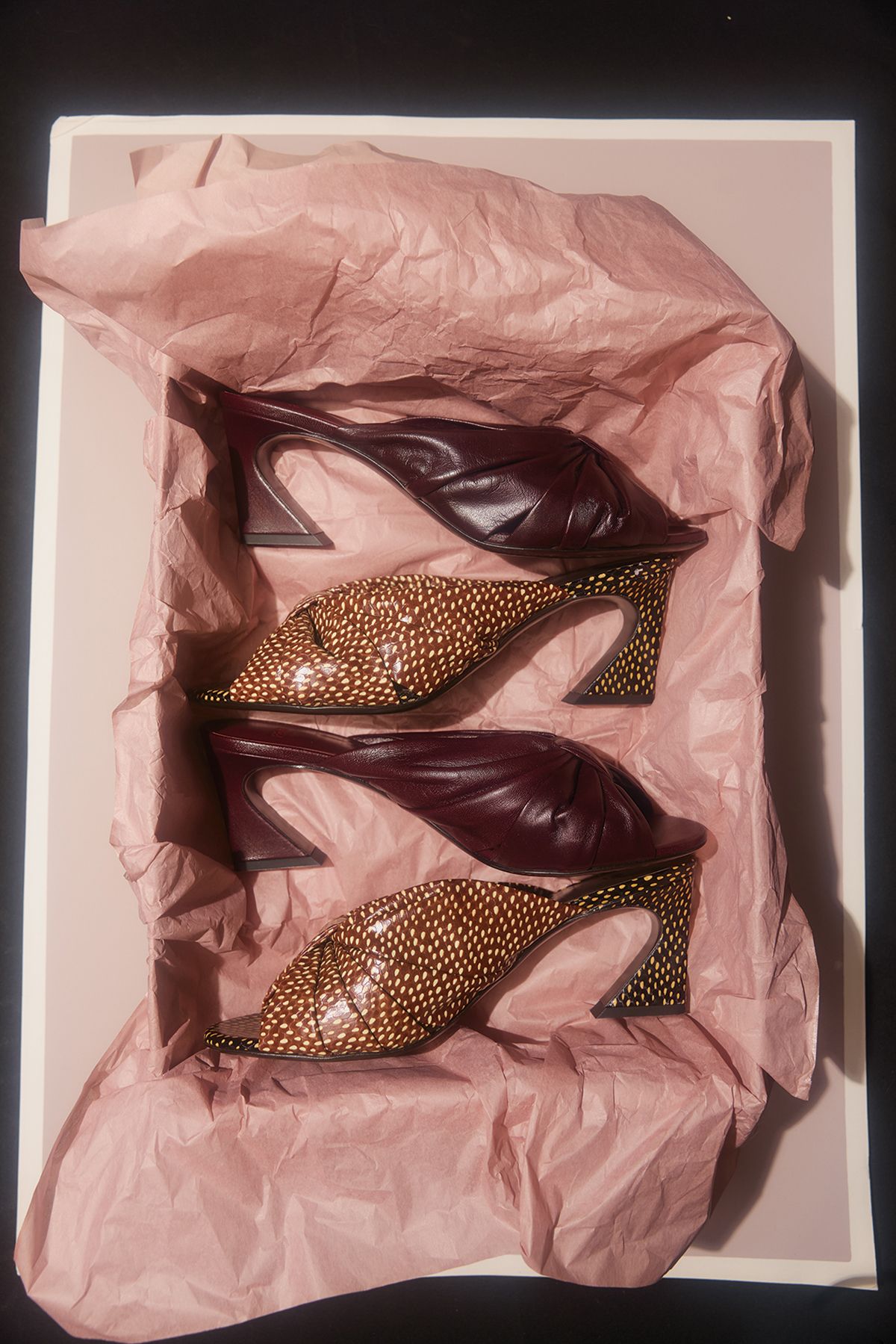 버건디 컬러 샌들 힐은 1백49만원대, 유니크한 패턴의 샌들 힐은 1백56만원대 Fendi.