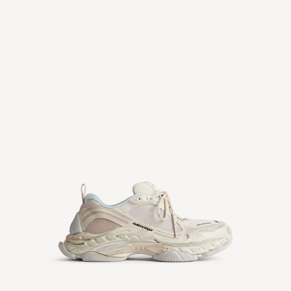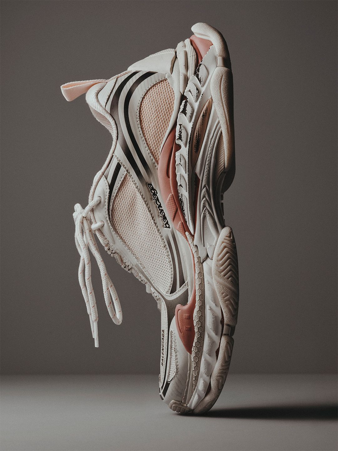 가장 눈에 띄는 변화는 아웃솔 구조. 켜켜이 쌓인 듯한 확장형 아웃솔은 서로 다른 세 가지 트레드 방향을 결합해 완성됐다. 총 68개의 개별 요소로 구성된 구조는, 서로 다른 스니커즈에서 추출한 듯한 텍스처와 흔적을 조형적으로 재구성해 트리플 S 특유의 볼륨감을 이어간다. 소재 역시 변화의 핵심. 메시 소재의 비중을 확대해 경량성과 통기성을 강화하면서, 기존 트리플 S가 지닌 묵직한 존재감은 유지했다.