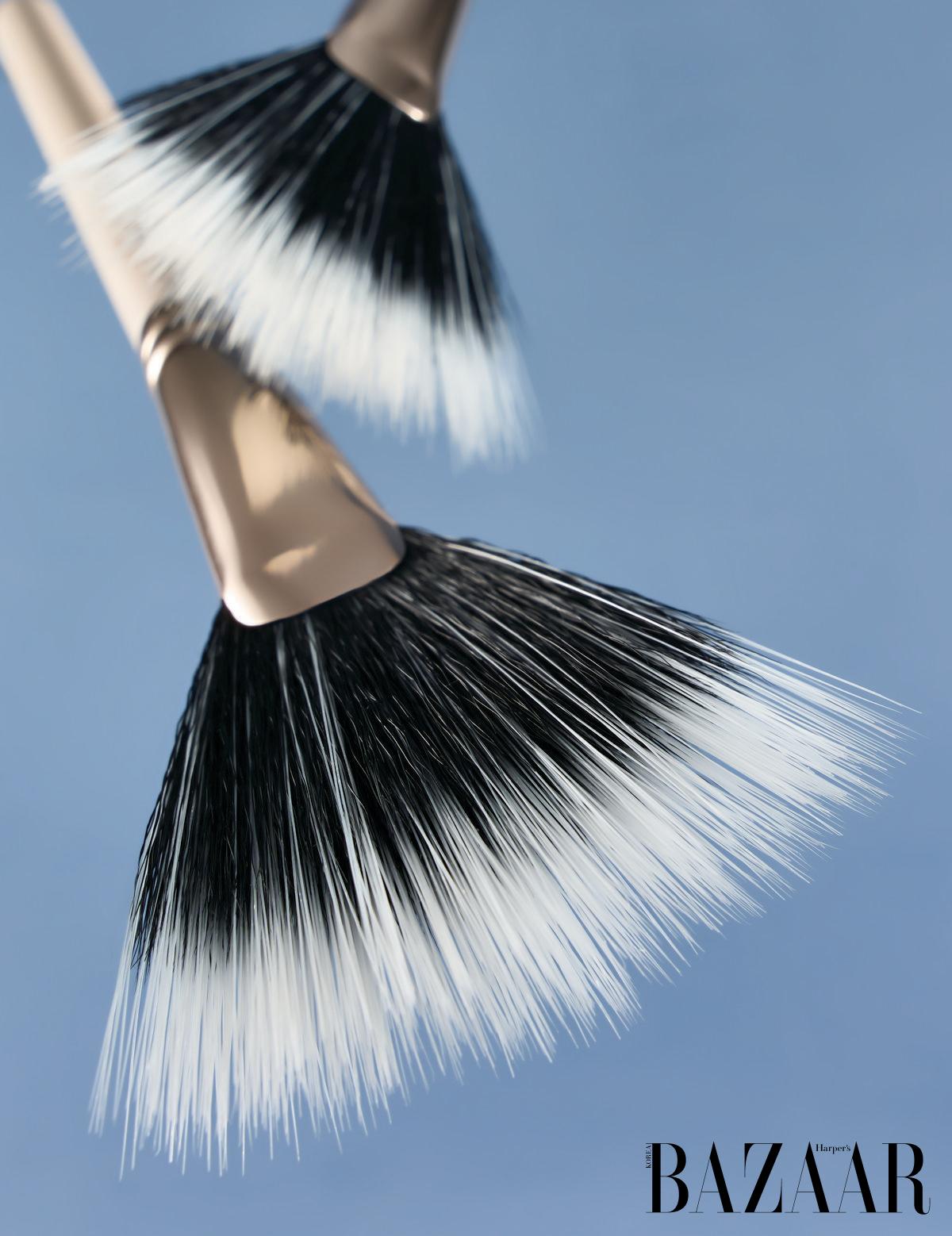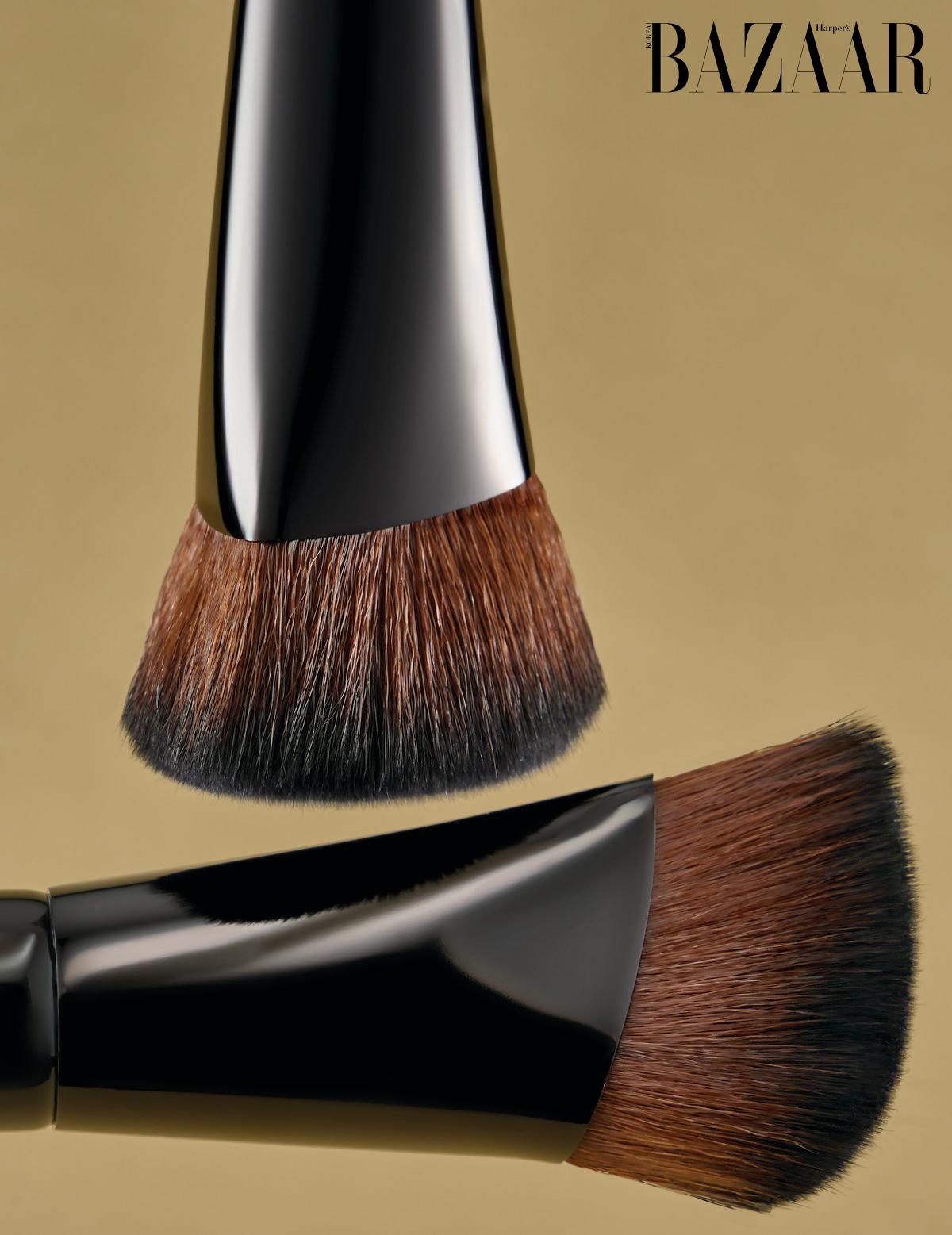 스모키부터 블루, 옐로 등 과감한 아이 메이크업을 즐긴다. 피부 표현은 최대한 가볍게 마무리하고 싶은 마음에 쓰기 시작한 툴이 로라 메르시에 파운데이션 브러시다. 풍성한 모가 물방울 모양의 돔 형태로 디자인돼 굴곡진 부위는 물론 다크서클처럼 커버가 어려운 곳에도 베이스를 얇고 섬세하게 밀착시킨다. 모가 제품을 과하게 흡수하지 않아 필요한 만큼만 덧바를 수 있는 것도 장점이다.