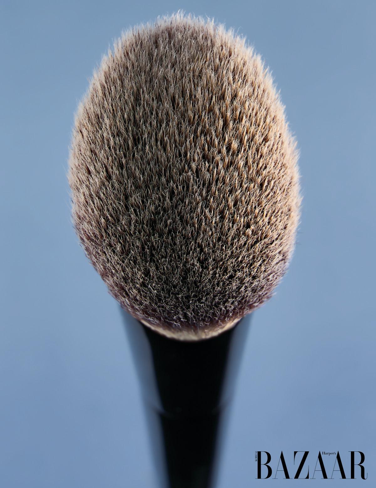 가수정 메이크업을 거의 하지 않아 아침 베이스에 특히 신경 쓴다. 스패철러로 파운데이션을 얇게 펴 바른 뒤, 브러시로 정돈한다. 이렇게만 해도 베이스가 오래 가는 비결은 초고밀도 합성모로 제작된 아워글래스 브러시 덕분이다. 베이스를 단순히 펴 바르는 게 아니라 모공과 잔주름 사이까지 밀어 넣는다. 단면이 비스듬히 커팅되어 있어서 커버가 더 필요한 부위에 브러시를 세워 한 번 더 터치하면 퍼프가 필요 없다.