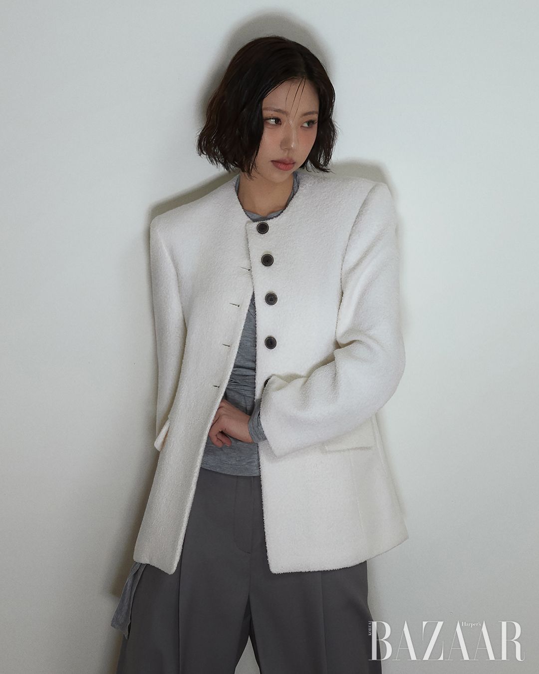 부클 트위드 재킷은 35만8천원, 이너 톱은 12만8천원, 테일러드 팬츠는 23만8천원 모두 Joy Gryson.
