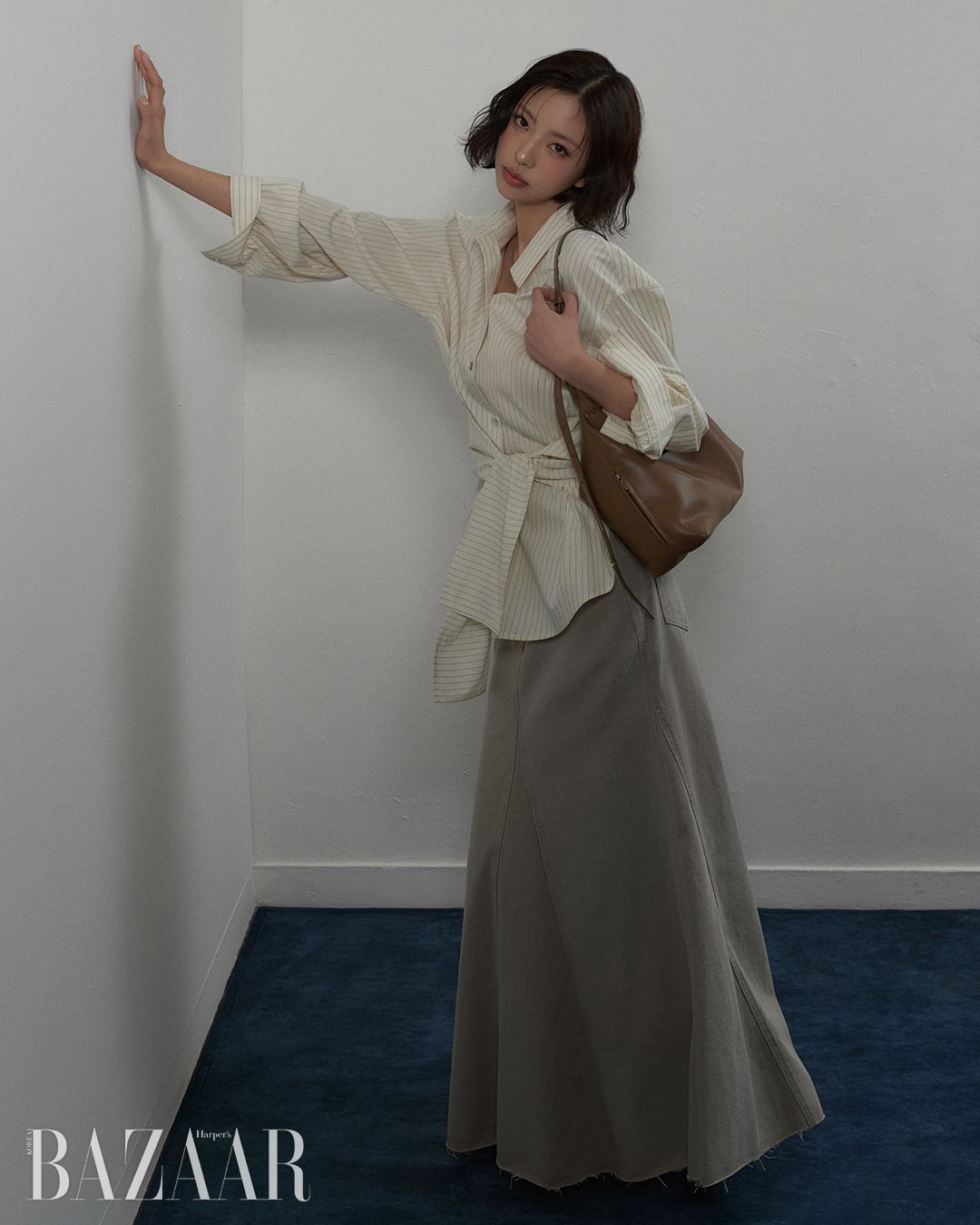 타이 랩 스트라이프 셔츠는 20만8천원, 워싱 데님 플레어스커트는 19만8천원, 버클 바이커 부츠는 25만8천원, 조절 가능한 스트랩으로 다양한 연출이 가능한 셀리 숄더백은 35만8천원 모두 Joy Gryson.