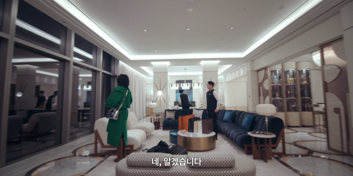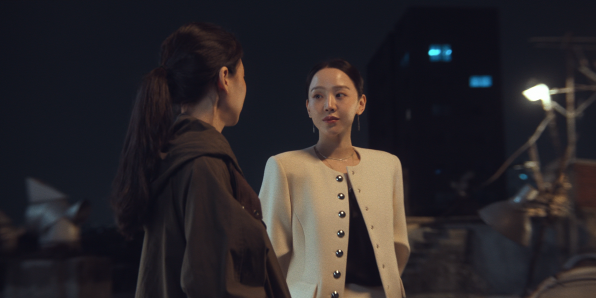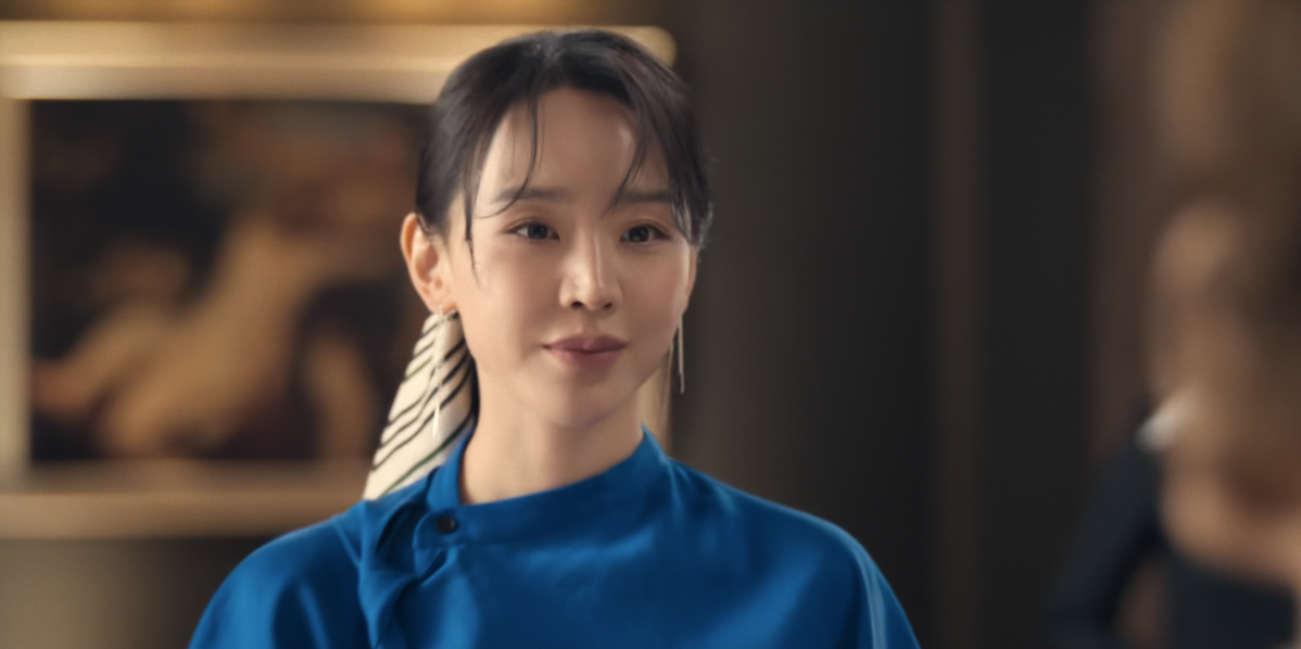반면, 최재우 회장과의 만남에서는 헤어를 리본으로 정리해 한층 부드러운 인상을 더했다. 김홍미 본부장을 대면할 때는 심플한 블랙 이어링으로 날 선 분위기를 강조했다면, 최재우 회장을 만나는 자리에서는 스퀘어 쉐입의 화려한 이어링을 선택해 존재감을 드러냈다.