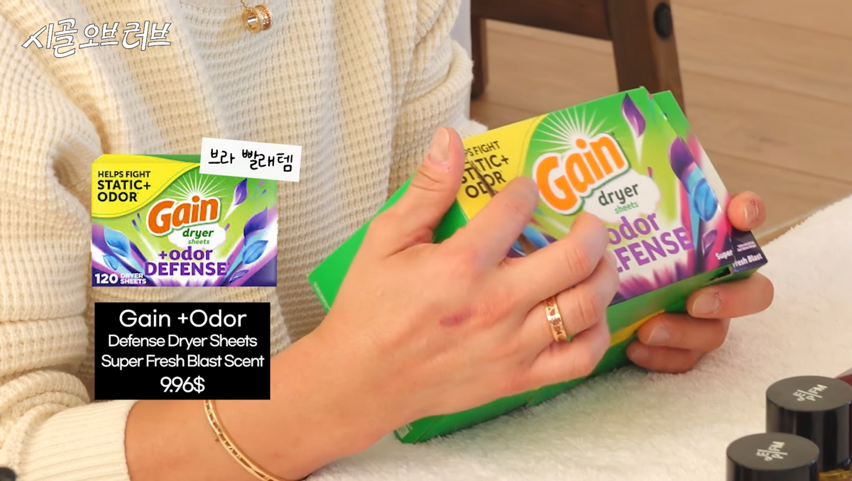 속옷, 양말, 타올 건조 시 사용하는 건조기 시트다. 보통 타월 빨래는 흡수력 때문에 섬유유연제를 쓰지 않는데, 건조기 시트는 써도 된다고. 그래서 브라이언이 운동하러 갈 때 사람들이 뭐 뿌렸냐는 질문을 자주 받는 아이템의 비밀이기도 하다.“제 살 냄새예요.”를 어필할수 있는 제품이란 말. 건조기 시트의 또 다른 활용 꿀팁도 공개했다. 여행 갈 때, 캐리어 안에 넣은 옷 사이사이 시트를 끼워 넣는 것. 캐리어 여는 순간 빨래한 것처럼 좋은 향과 함께 귀국이 가능하다.