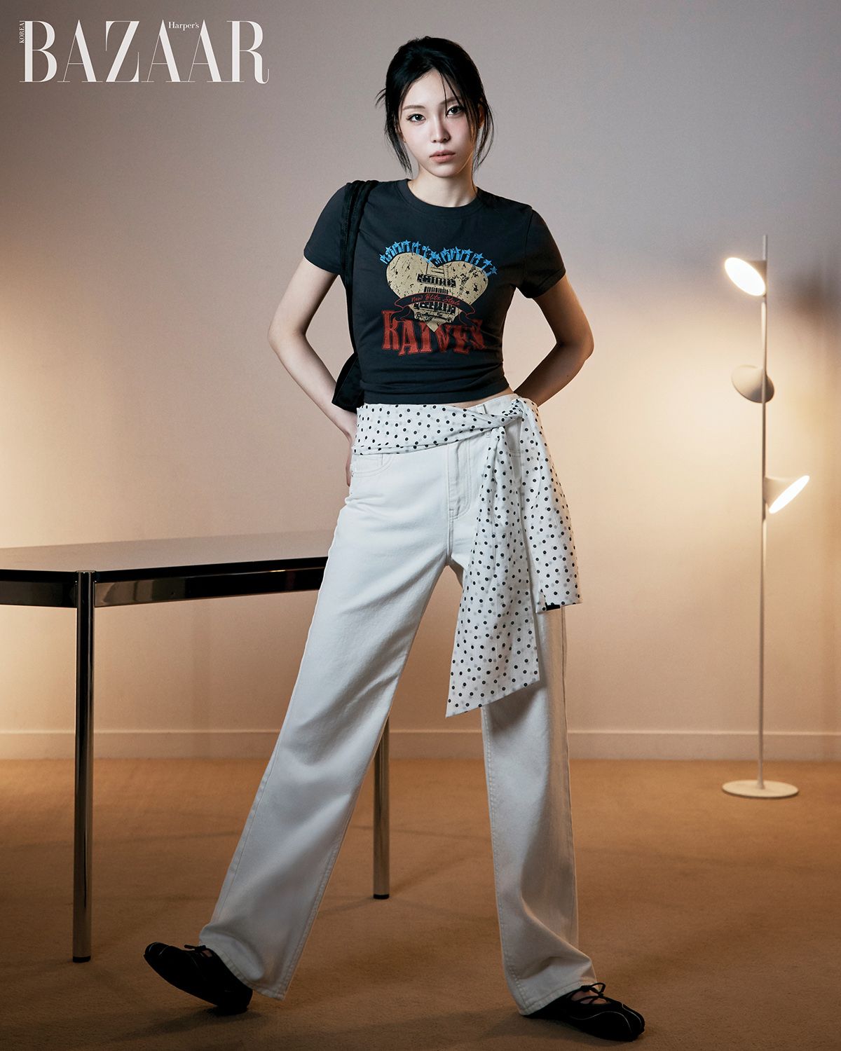그래픽 티셔츠는 5만원대, 데님 팬츠는 9만원대, 허리에 두른 스카프는 2만원대, 어깨에 멘 숄더백은 8만원대, 메리제인 스니커즈는 10만원대 모두 Raive.