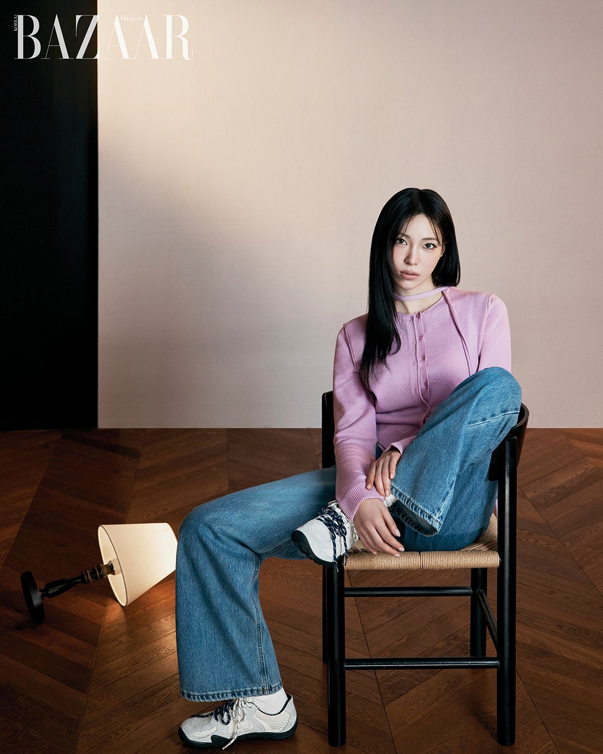 타이 디테일 카디건은 14만원대, 폴디드 데님 팬츠는 15만원대, 메시 스니커즈는 12만원대 모두 Raive. 양말은 에디터 소장품.