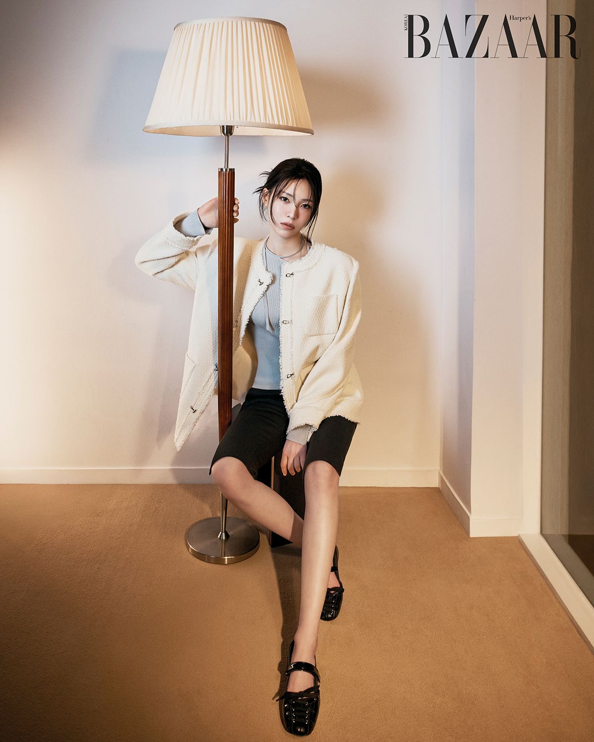 트위드 재킷은 23만원대, 언밸런스 스트랩 니트 톱은 11만원대, 랩 스커트를 탈착 가능한 카프리 팬츠는 12만원대, 플랫 슈즈는 10만원대 모두 Raive.